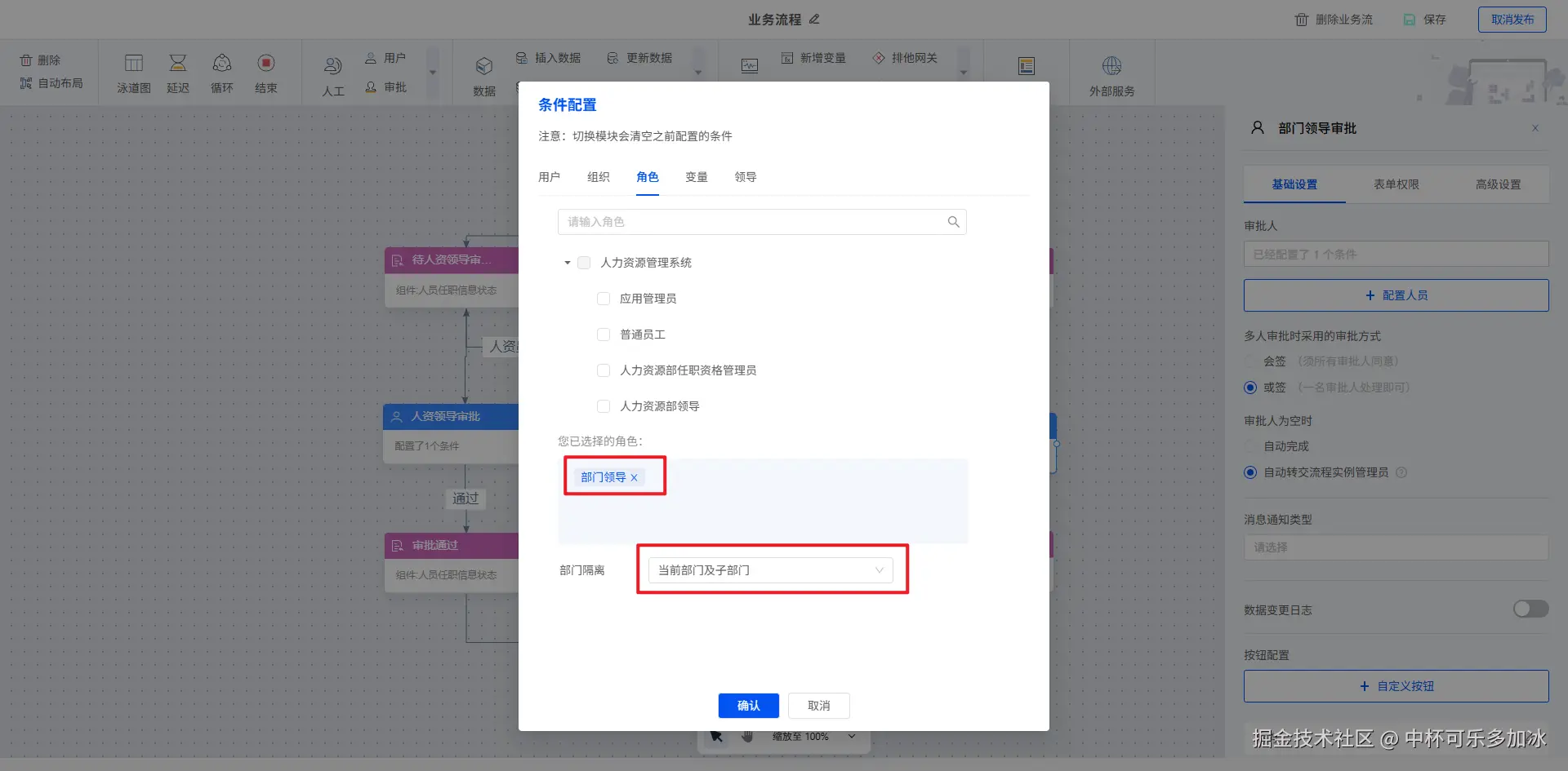 完成后,针对审批节点,我们需要为不同角色配置操作权限。