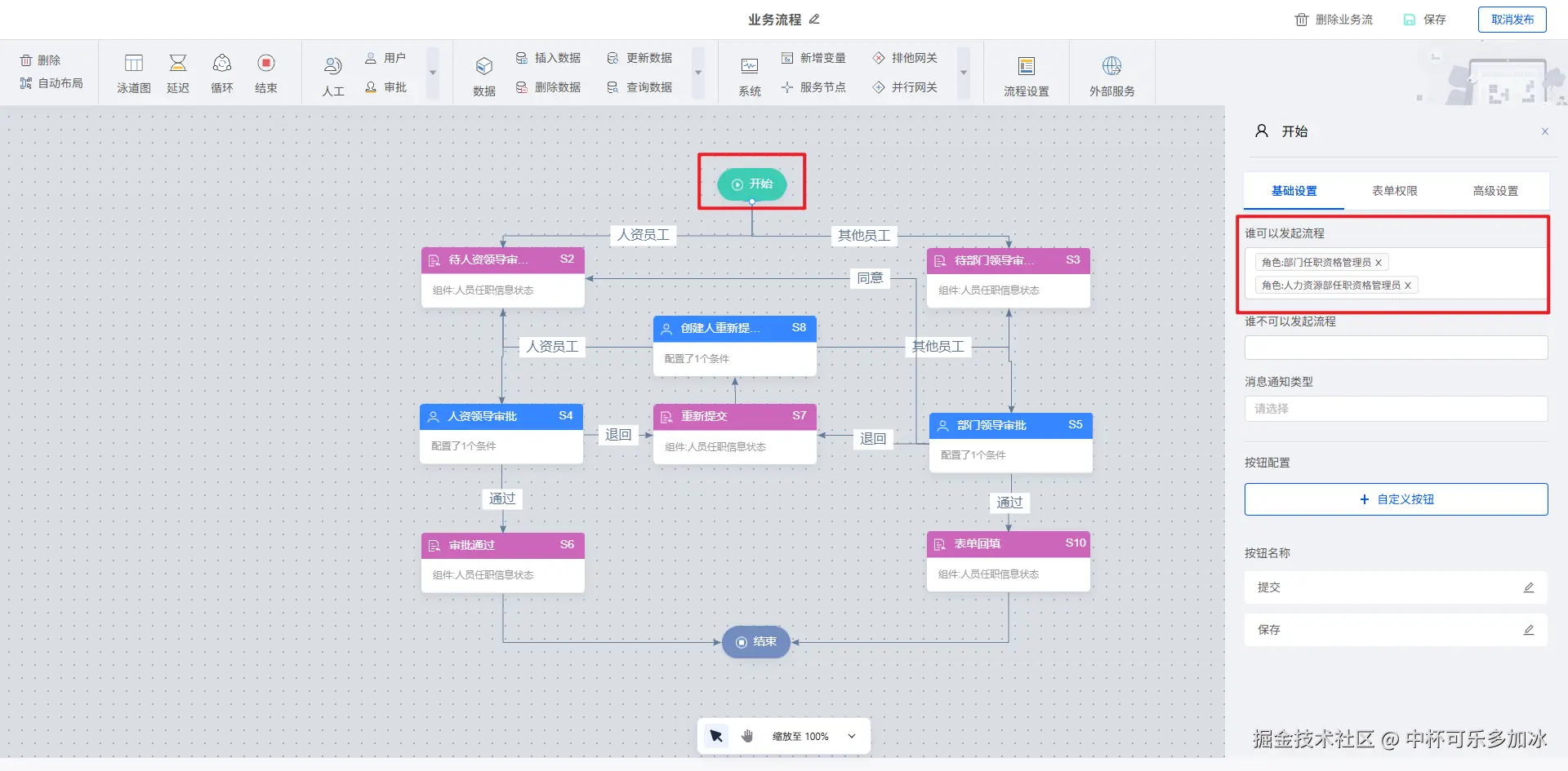 在开始节点中,我们设定人力资源部和其他部门的任职资格管理员都可以新增人员任职资格表单,表单权限中能够快速隐藏不需要填写的状态字段。