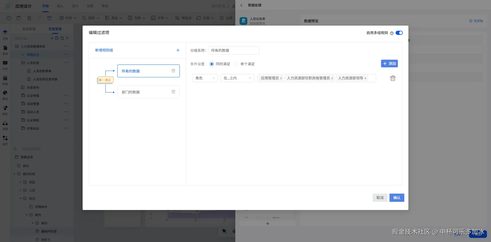 开启数据权限的多组规则。第一个是查看所有数据的规则组,若用户角色为应用管理员、人力资源部任职资格管理员或人力资源部领导其中之一,即可根据此规则组查看全部数据。