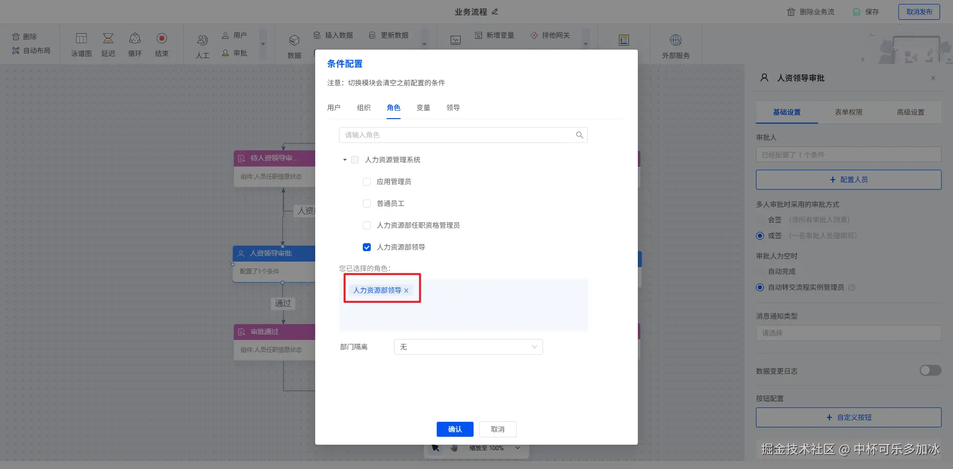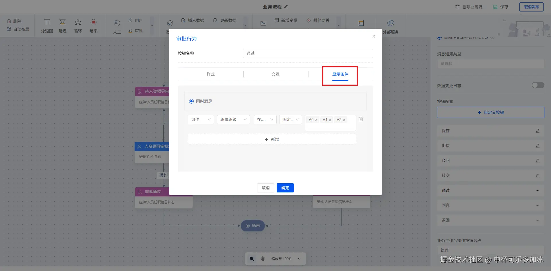 下面我们来到行内按钮。第一个审批按钮,人力资源部领导拥有审批权限。所以在显示条件中进行配置,当状态等于:待人力资源部领导审批,角色为:人力资源部领导,两个条件同时满足时按钮才会显示。