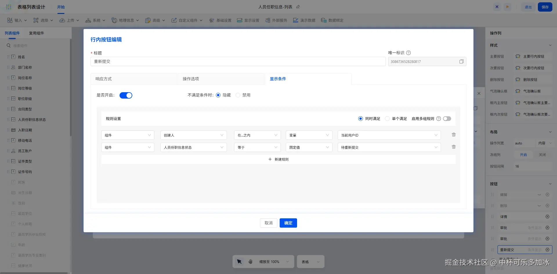 如果我们还希望包含一个重新提交按钮,用于该条数据退回后,创建人进行重新提交。只需在显示条件中设定创建人与当前用户ID进行匹配。