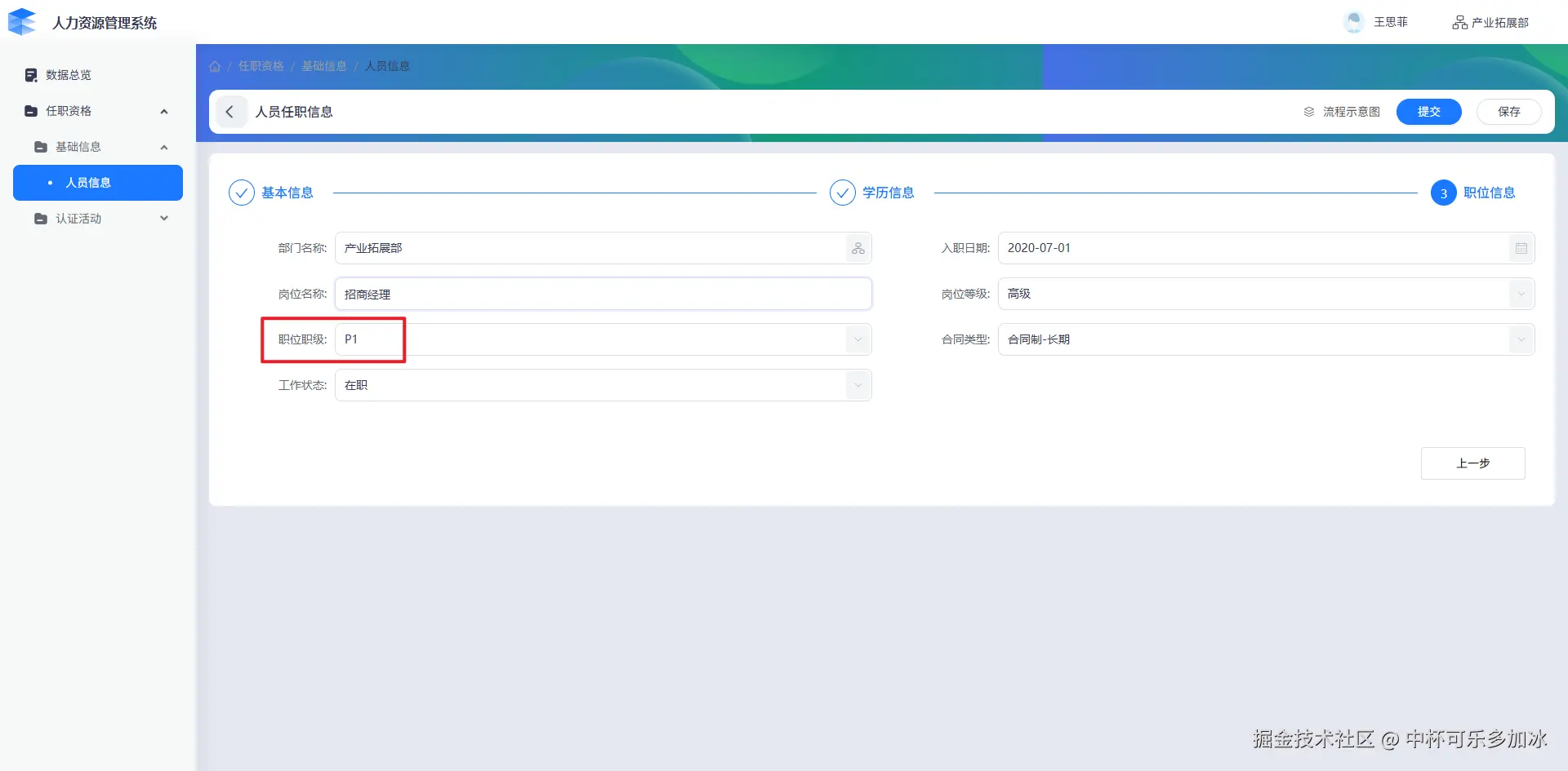 预览应用,登录一个部门任职资格管理员账户进行权限相关的测试。新增一条员工任职信息,职位职级选择大于A级,完成后提交。