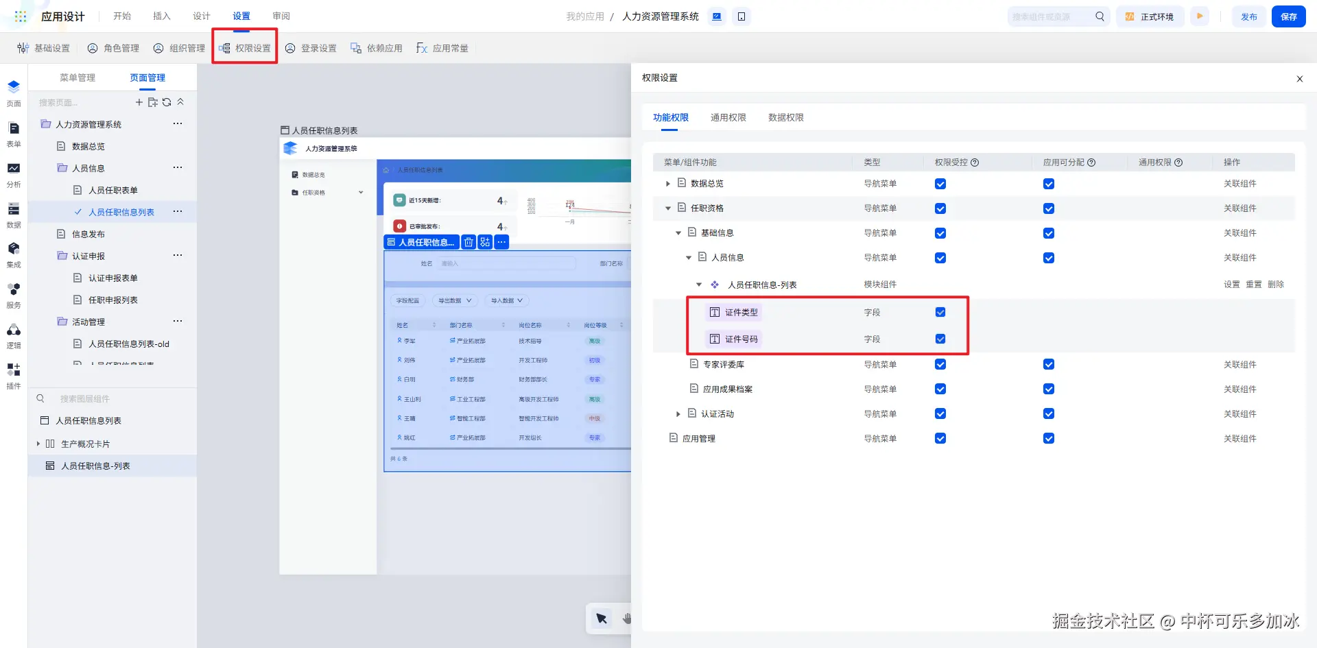 现在,我们已经实现了数据的横向隔离,下面还可以更进一步,根据不同字段的敏感度,实现列表字段级的权限控制。在权限设置中,针对列表中的敏感信息:身份证号码,我们开启证件类型和证件号码字段的权限受控。