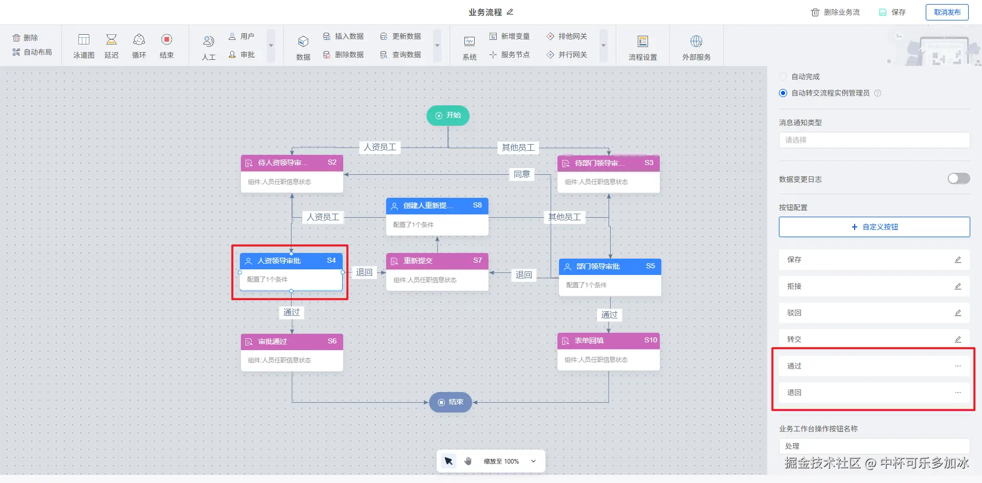 人力资源部领导节点:新增按钮用于通过和退回的审批操作。若用户点击通过按钮,状态会更新为“审批通过”,退回则表单返回创建人重新提交。