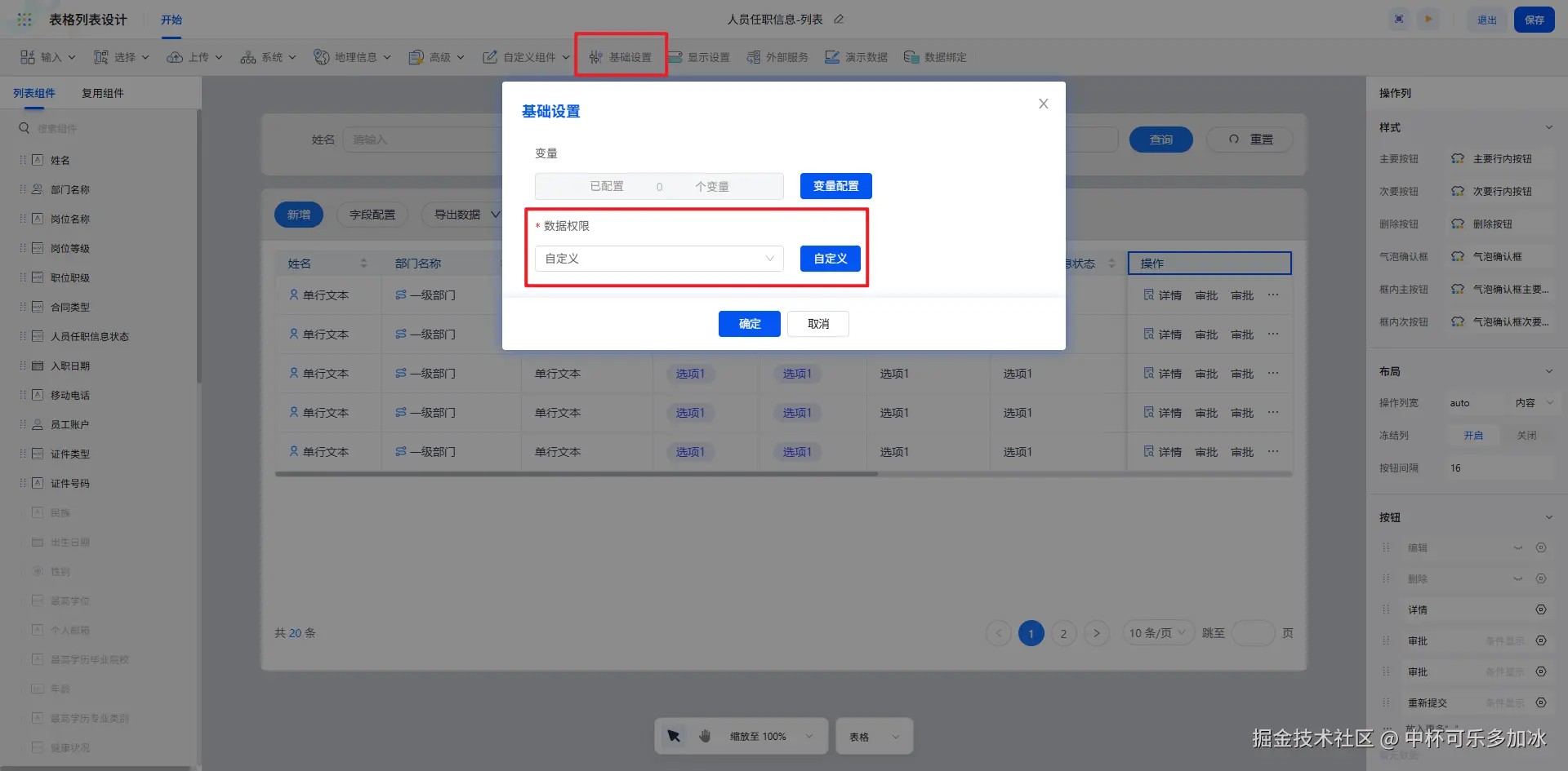 现在,我们已经完成了业务流相关权限的配置。接下来,我们聚焦到人员任职信息的列表页,配置列表的全局按钮和行内按钮的操作权限。
