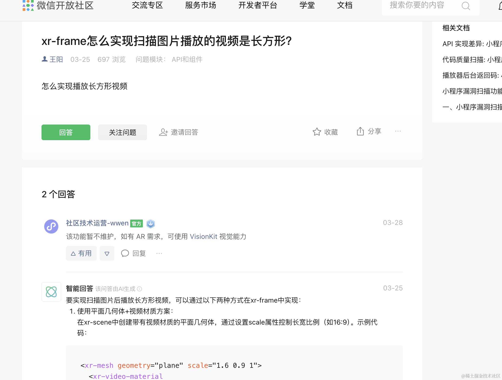 但是好在找到一个别的小程序可以实现播放竖屏视频的demo,又开始继续研究,然后到微信社区继续找,别人也同样有遇到过这样的问题,但是却没有什么答案,只有一个智能回答: