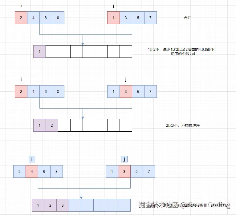 核心原理:当左子数组的当前元素 temp[i]大于右子数组的当前元素 temp[j]时,左子数组中从 i到 mid的所有元素都与 temp[j]构成逆序对,因为左右子数组都是有序的