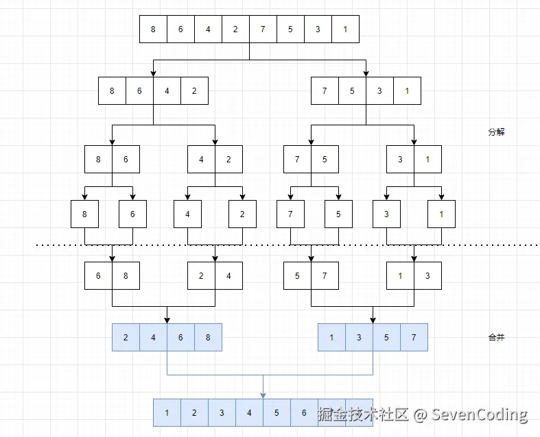 在归并排序的基础上稍微改动即可。以数组[8,6,4,2,7,5,3,1]为例: