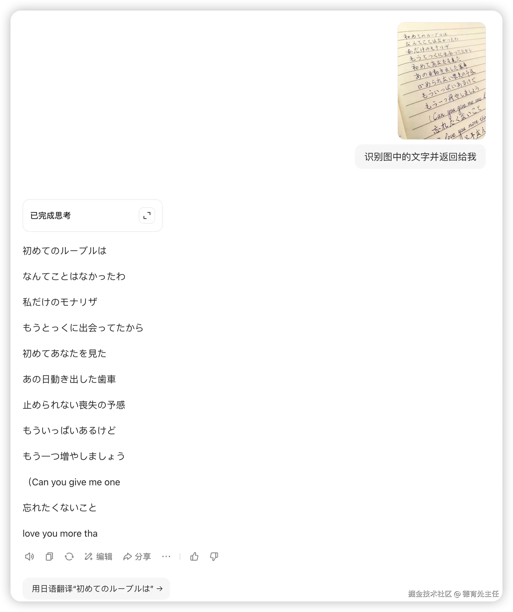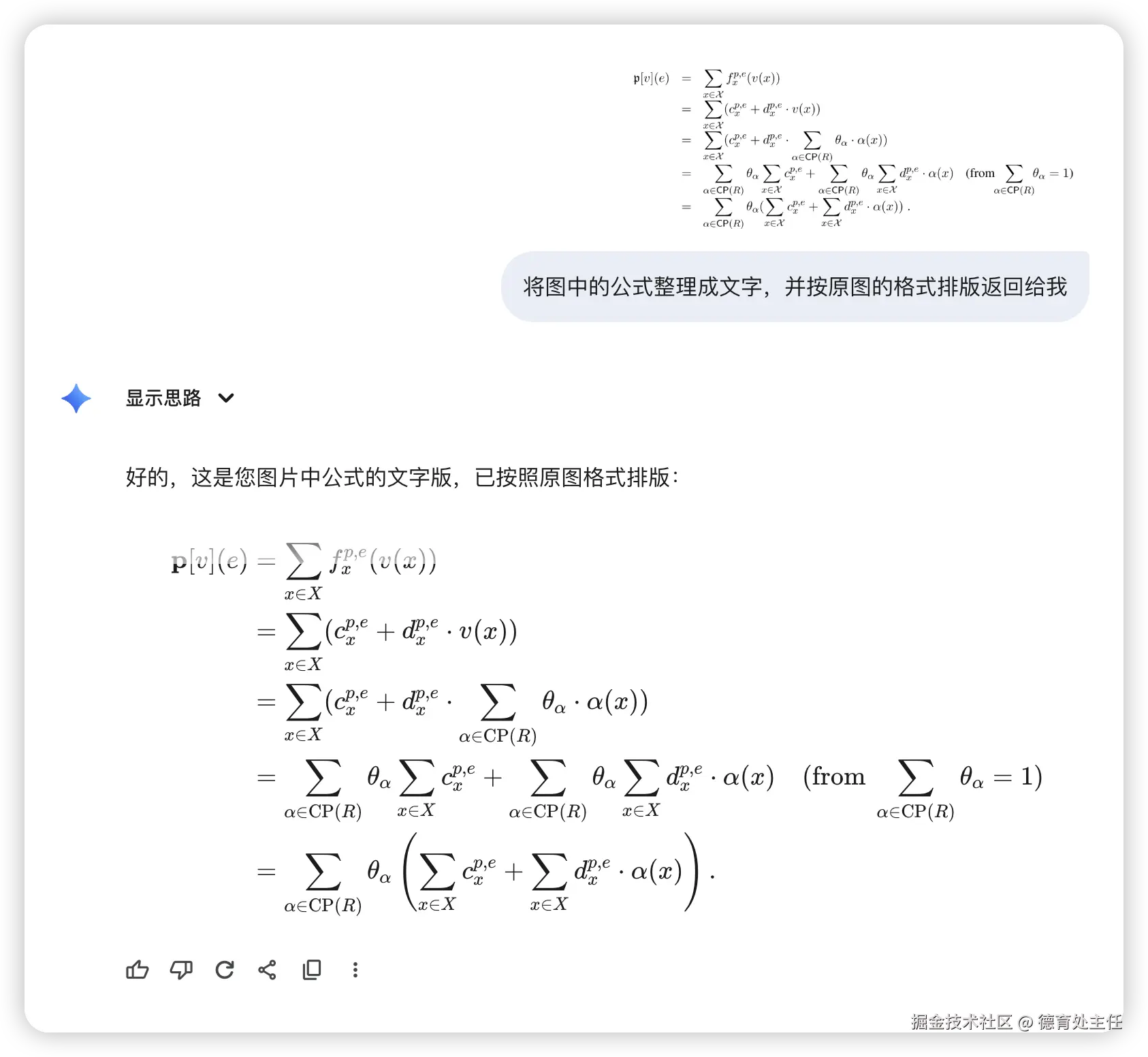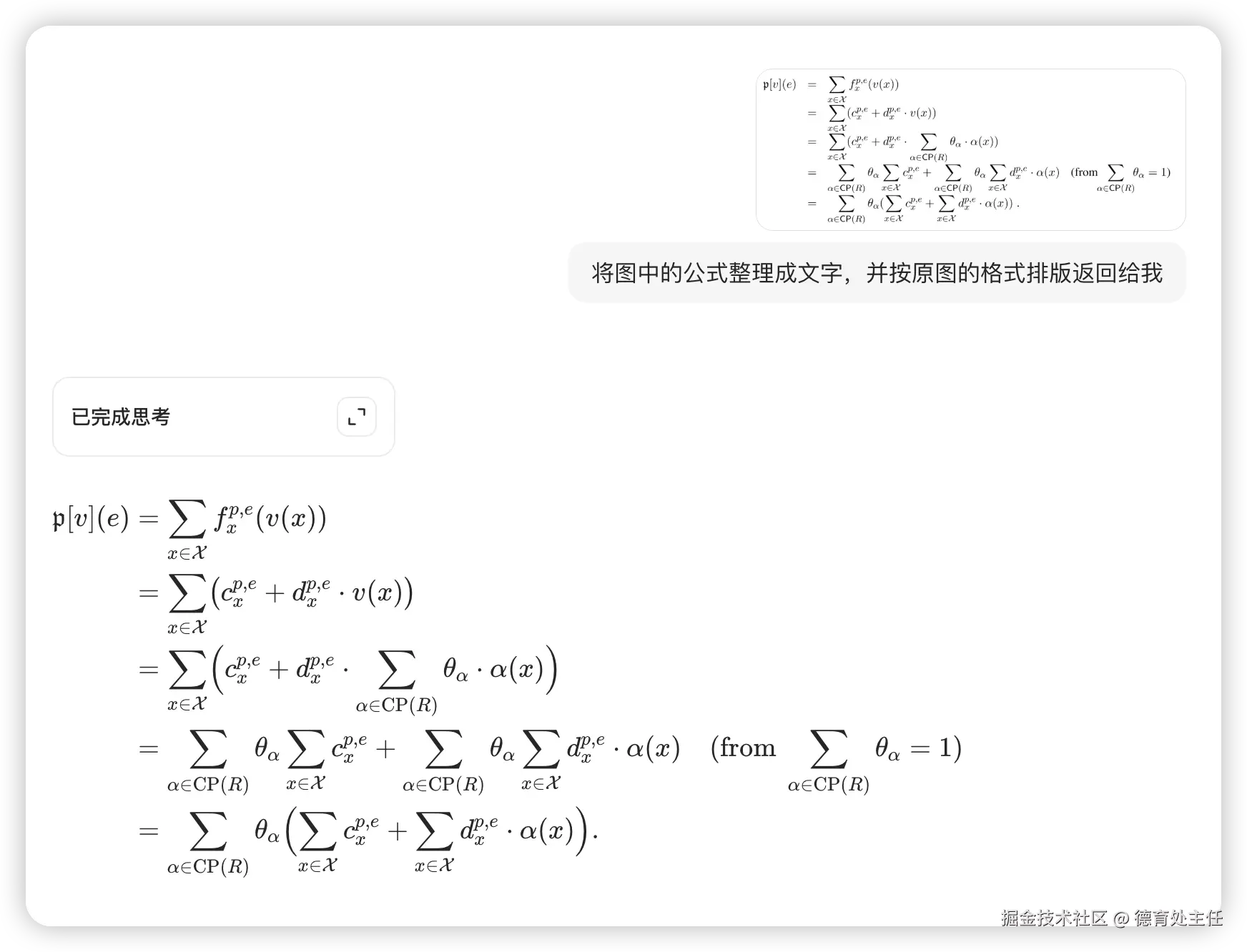 ChatGPT同样识别准确,但它默认返回的是LaTeX代码,需要用户自行使用工具转换才能看到最终效果,在用户体验上略有不便。