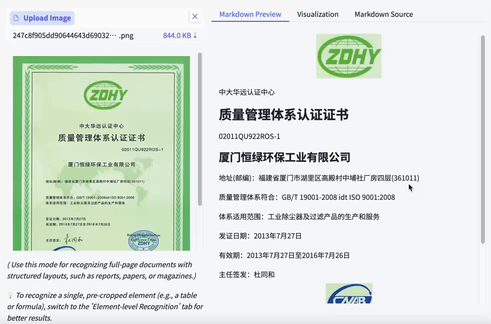 这次测试的图片是一张中大华远认证中心的《质量管理体系认证证书》,图片包含了标准的黑体字、手写签名以及证书的特殊标识。