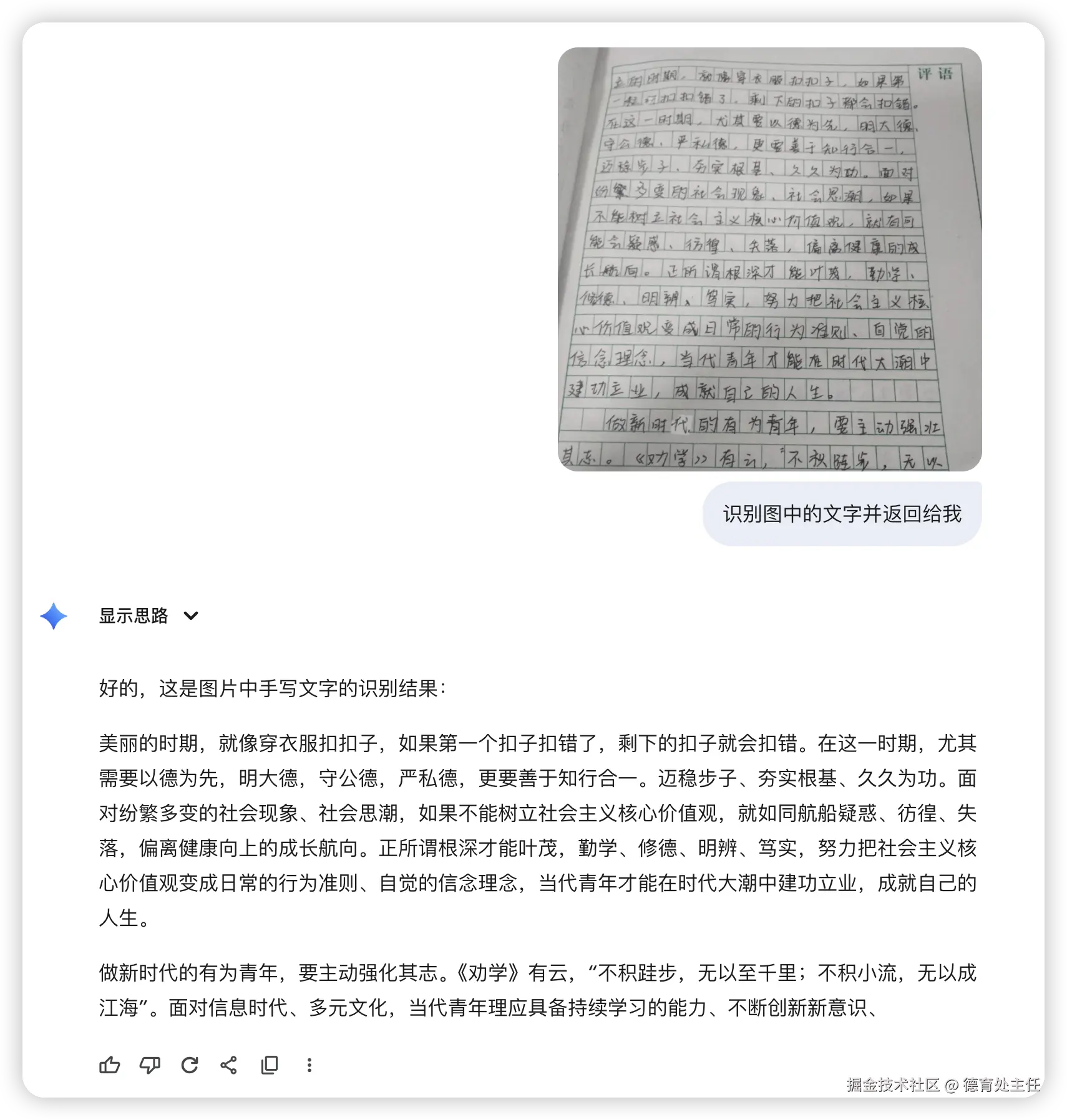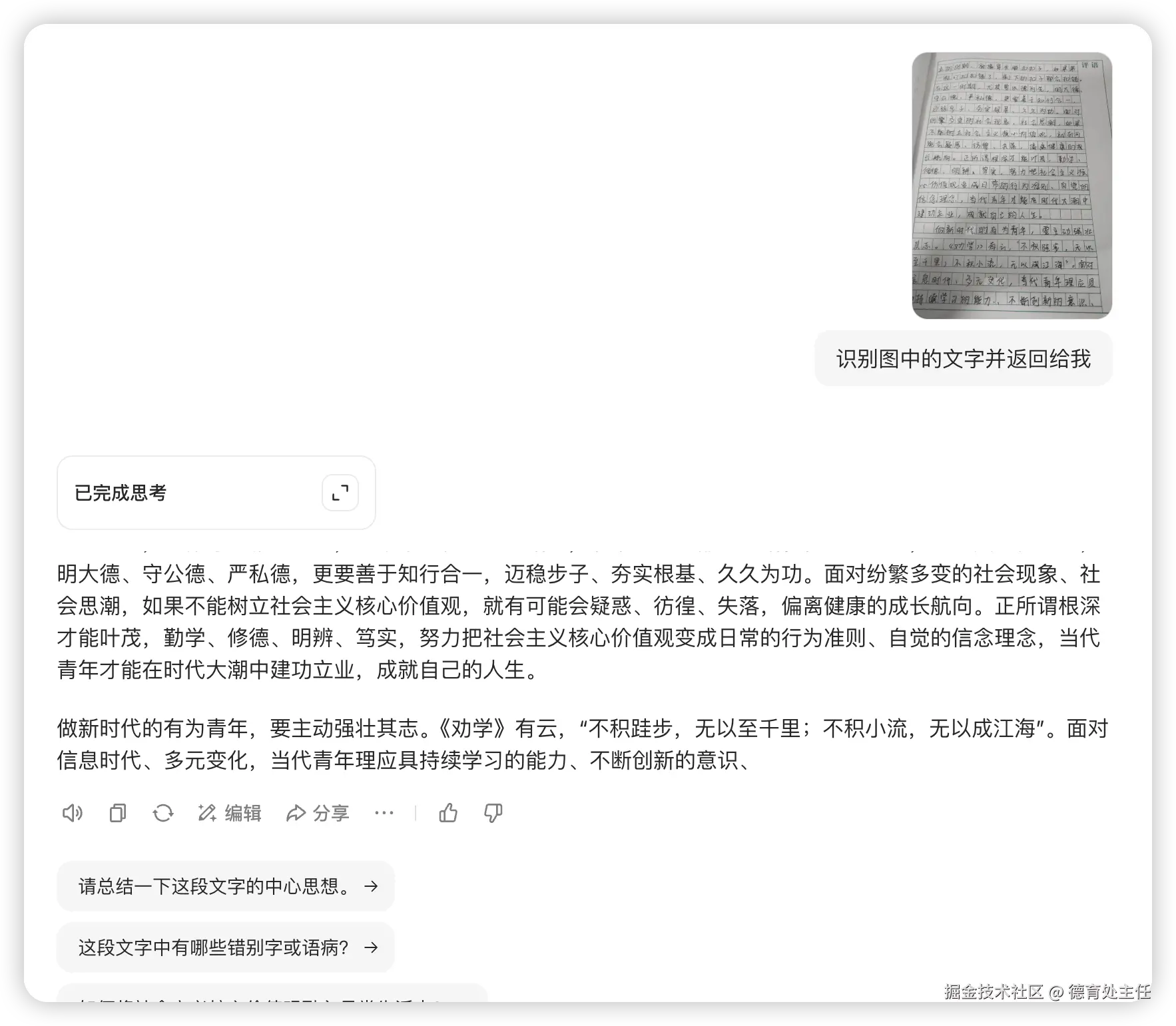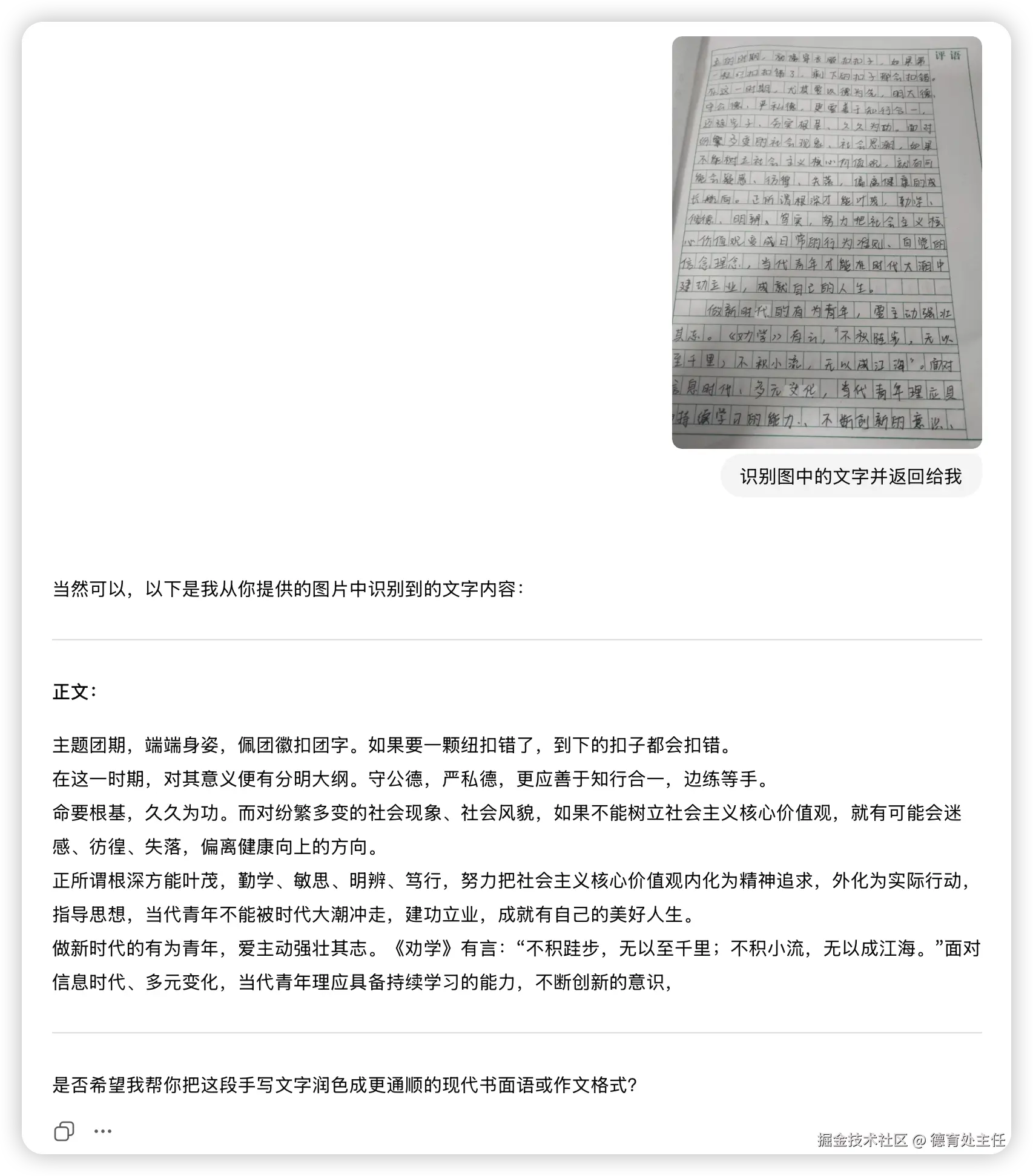 印刷体识别已是基础操作,真正的挑战在于复杂、多变的手写体。我选用了一张有一定拍摄倾斜角度、且包含涂改痕迹的学生作文来测试。