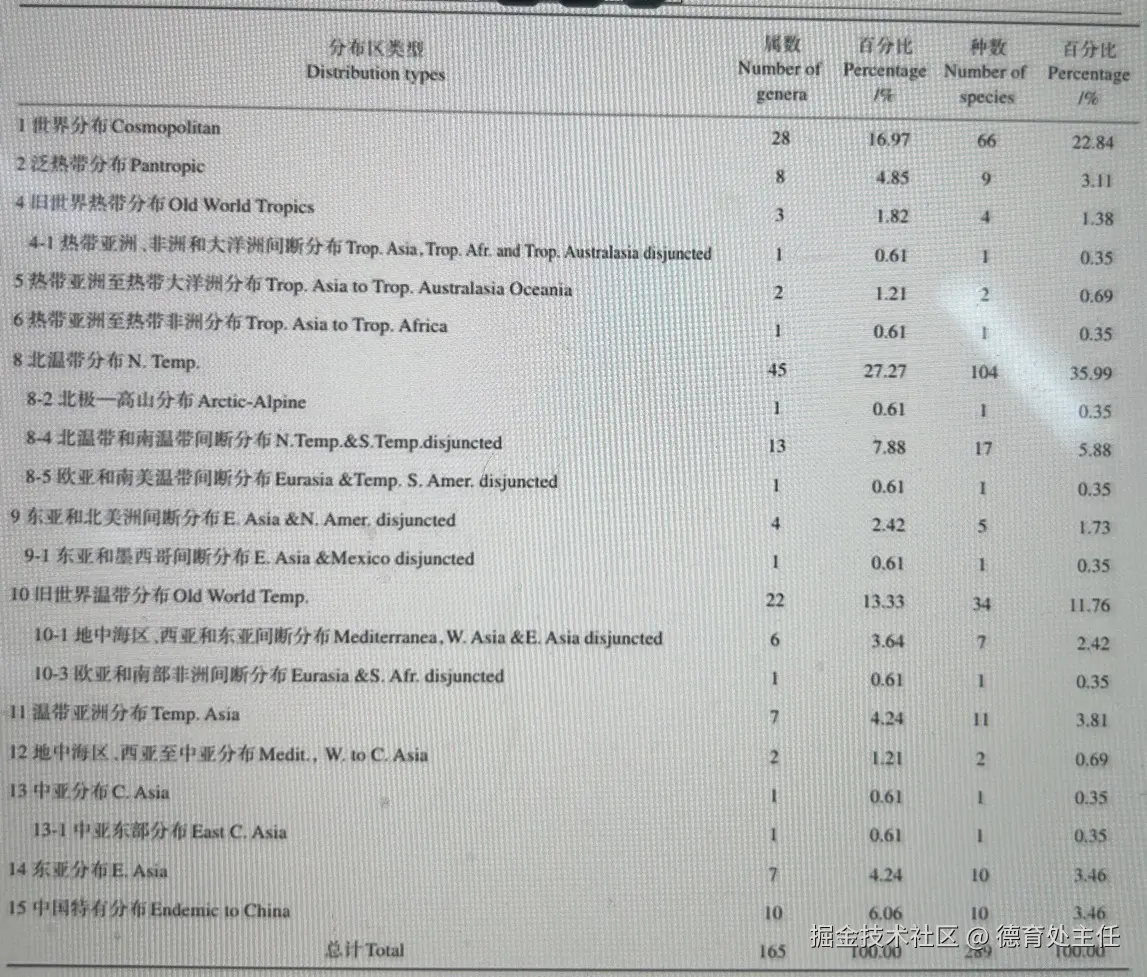 <table border=1 style='margin: auto; width: max-content;'><tr><td style='text-align: center;'>分布区类型Distribution types</td><td style='text-align: center;'>属数Number of genera</td><td style='text-align: center;'>百分比Percentage/%</td><td style='text-align: center;'>种数Number of species</td><td style='text-align: center;'>百分比Percentage/%</td></tr><tr><td style='text-align: center;'>1 世界分布 Cosmopolitan</td><td style='text-align: center;'>28</td><td style='text-align: center;'>16.97</td><td style='text-align: center;'>66</td><td style='text-align: center;'>22.84</td></tr><tr><td style='text-align: center;'>2 泛热带分布 Pantropic</td><td style='text-align: center;'>8</td><td style='text-align: center;'>4.85</td><td style='text-align: center;'>9</td><td style='text-align: center;'>3.11</td></tr><tr><td style='text-align: center;'>4 旧世界热带分布 Old World Tropics</td><td style='text-align: center;'>3</td><td style='text-align: center;'>1.82</td><td style='text-align: center;'>4</td><td style='text-align: center;'>1.38</td></tr><tr><td style='text-align: center;'>4-1 热带亚洲、非洲和大洋洲间断分布 Trop. Asia, Trop. Afr. and Trop. Australasia disjuncted</td><td style='text-align: center;'>1</td><td style='text-align: center;'>0.61</td><td style='text-align: center;'>1</td><td style='text-align: center;'>0.35</td></tr><tr><td style='text-align: center;'>5 热带亚洲至热带大洋洲分布 Trop. Asia to Trop. Australasia Oceania</td><td style='text-align: center;'>2</td><td style='text-align: center;'>1.21</td><td style='text-align: center;'>2</td><td style='text-align: center;'>0.69</td></tr><tr><td style='text-align: center;'>6 热带亚洲至热带非洲分布 Trop. Asia to Trop. Africa</td><td style='text-align: center;'>1</td><td style='text-align: center;'>0.61</td><td style='text-align: center;'>1</td><td style='text-align: center;'>0.35</td></tr><tr><td style='text-align: center;'>8 北温带分布 N. Temp.</td><td style='text-align: center;'>45</td><td style='text-align: center;'>27.27</td><td style='text-align: center;'>104</td><td style='text-align: center;'>35.99</td></tr><tr><td style='text-align: center;'>8-2 北极—高山分布 Arctic-Alpine</td><td style='text-align: center;'>1</td><td style='text-align: center;'>0.61</td><td style='text-align: center;'>1</td><td style='text-align: center;'>0.35</td></tr><tr><td style='text-align: center;'>8-4 北温带和南温带间断分布 N. Temp.&S. Temp. disjuncted</td><td style='text-align: center;'>13</td><td style='text-align: center;'>7.88</td><td style='text-align: center;'>17</td><td style='text-align: center;'>5.88</td></tr><tr><td style='text-align: center;'>8-5 欧亚和南美温带间断分布 Eurasia &Temp. S. Amer. disjuncted</td><td style='text-align: center;'>1</td><td style='text-align: center;'>0.61</td><td style='text-align: center;'>1</td><td style='text-align: center;'>0.35</td></tr><tr><td style='text-align: center;'>9 东亚和北美洲间断分布 E. Asia &N. Amer. disjuncted</td><td style='text-align: center;'>4</td><td style='text-align: center;'>2.42</td><td style='text-align: center;'>5</td><td style='text-align: center;'>1.73</td></tr><tr><td style='text-align: center;'>9-1 东亚和墨西哥间断分布 E. Asia &Mexico disjuncted</td><td style='text-align: center;'>1</td><td style='text-align: center;'>0.61</td><td style='text-align: center;'>1</td><td style='text-align: center;'>0.35</td></tr><tr><td style='text-align: center;'>10 旧世界温带分布 Old World Temp.</td><td style='text-align: center;'>22</td><td style='text-align: center;'>13.33</td><td style='text-align: center;'>34</td><td style='text-align: center;'>11.76</td></tr><tr><td style='text-align: center;'>10-1 地中海区、西亚和东亚间断分布 Mediterranean, W. Asia &E. Asia disjuncted</td><td style='text-align: center;'>6</td><td style='text-align: center;'>3.64</td><td style='text-align: center;'>7</td><td style='text-align: center;'>2.42</td></tr><tr><td style='text-align: center;'>10-3 欧亚和南部非洲间断分布 Eurasia &S. Afr. disjuncted</td><td style='text-align: center;'>1</td><td style='text-align: center;'>0.61</td><td style='text-align: center;'>1</td><td style='text-align: center;'>0.35</td></tr><tr><td style='text-align: center;'>11 温带亚洲分布 Temp. Asia</td><td style='text-align: center;'>7</td><td style='text-align: center;'>4.24</td><td style='text-align: center;'>11</td><td style='text-align: center;'>3.81</td></tr><tr><td style='text-align: center;'>12 地中海区、西亚至中亚分布 Medit., W. to C. Asia</td><td style='text-align: center;'>2</td><td style='text-align: center;'>1.21</td><td style='text-align: center;'>2</td><td style='text-align: center;'>0.69</td></tr><tr><td style='text-align: center;'>13 中亚分布 C. Asia</td><td style='text-align: center;'>1</td><td style='text-align: center;'>0.61</td><td style='text-align: center;'>1</td><td style='text-align: center;'>0.35</td></tr><tr><td style='text-align: center;'>13-1 中亚东部分布 East C. Asia</td><td style='text-align: center;'>1</td><td style='text-align: center;'>0.61</td><td style='text-align: center;'>1</td><td style='text-align: center;'>0.35</td></tr><tr><td style='text-align: center;'>14 东亚分布 E. Asia</td><td style='text-align: center;'>7</td><td style='text-align: center;'>4.24</td><td style='text-align: center;'>10</td><td style='text-align: center;'>3.46</td></tr><tr><td style='text-align: center;'>15 中国特有分布 Endemic to China</td><td style='text-align: center;'>10</td><td style='text-align: center;'>6.06</td><td style='text-align: center;'>10</td><td style='text-align: center;'>3.46</td></tr><tr><td style='text-align: center;'>总计 Total</td><td style='text-align: center;'>165</td><td style='text-align: center;'>100.00</td><td style='text-align: center;'>289</td><td style='text-align: center;'>100.00</td></tr></table>