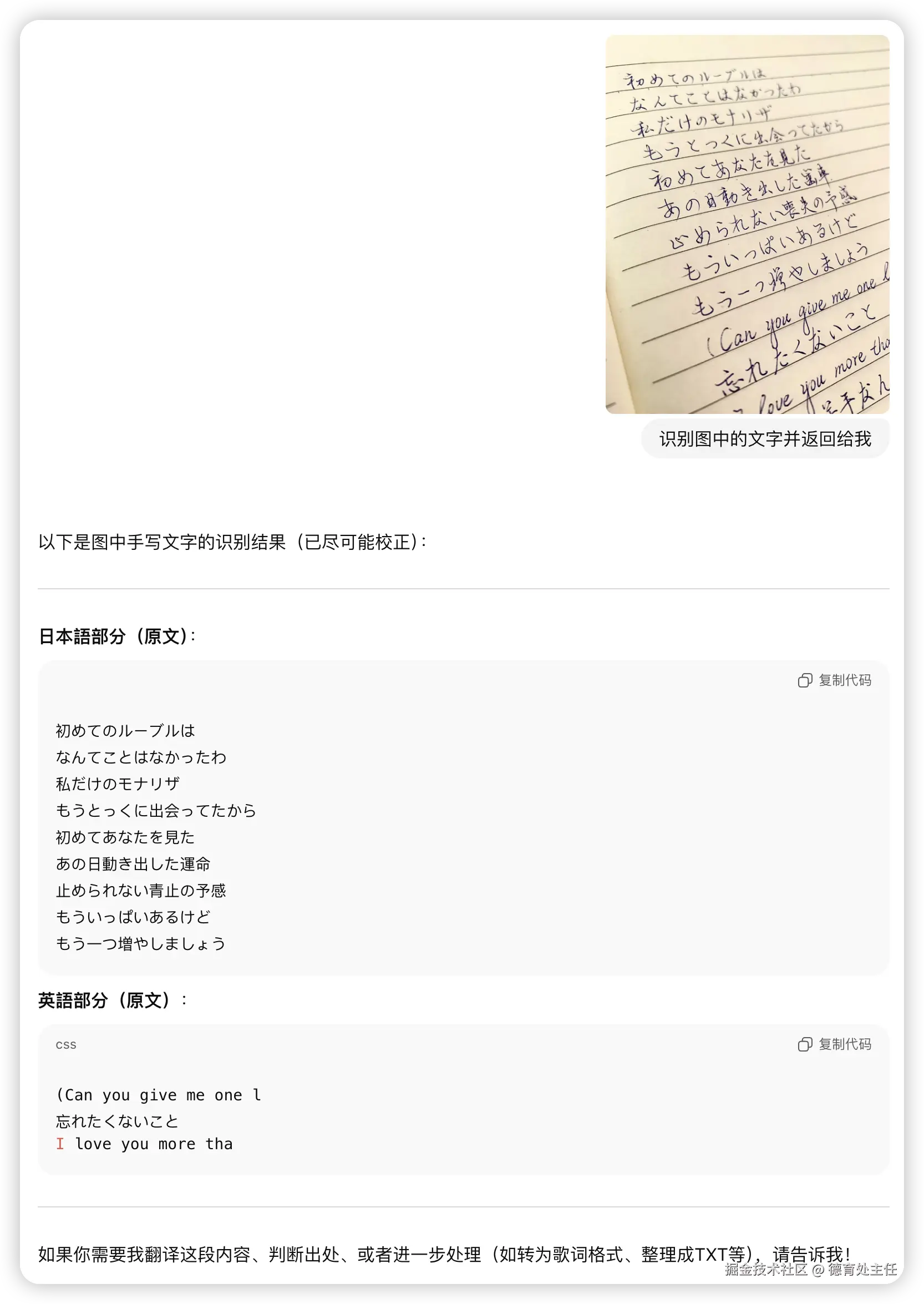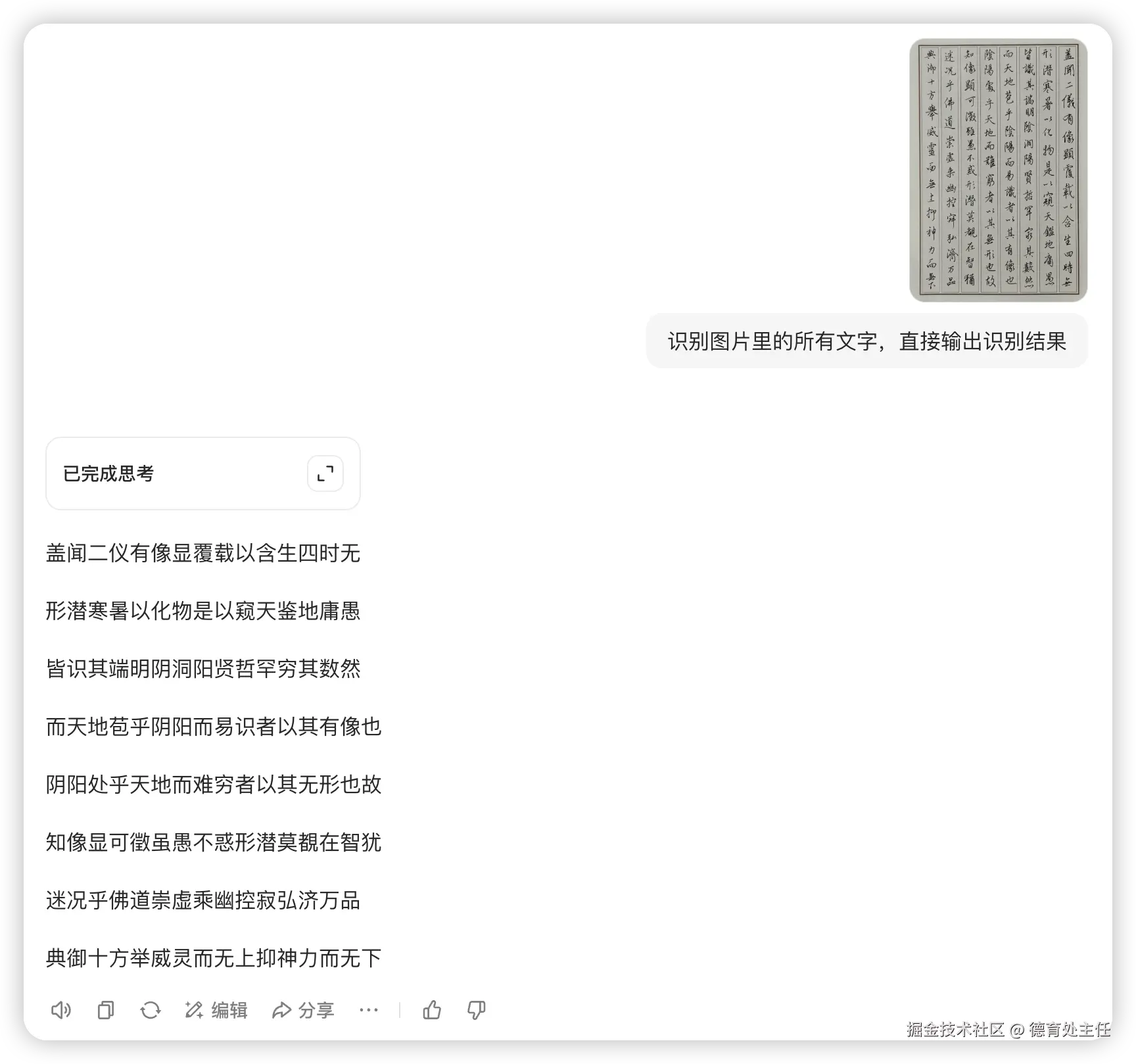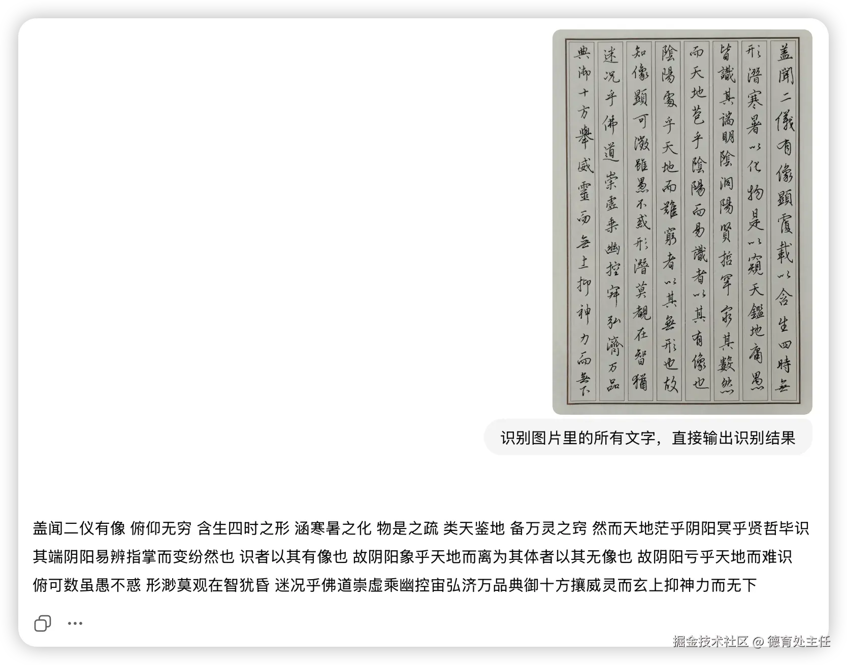 开局就出现错乱,更严重的是,它似乎在我的提示词“识别图中的文字并返回给我”之外,进行了“自我润色”,这在要求精准还原的OCR任务中是严重的大忌。