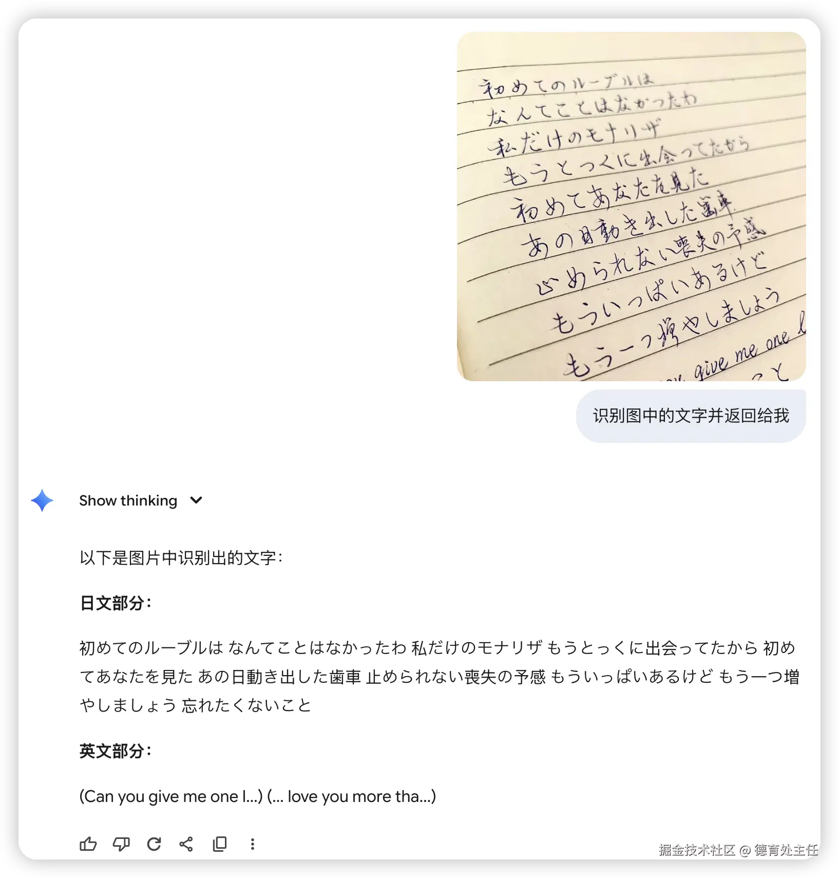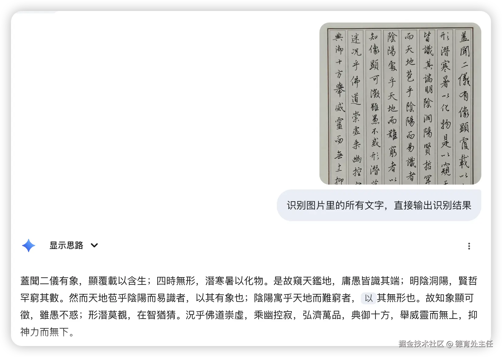 Gemini也能识别出图片的内容,但可能检测到图片中存在繁体中文,所以返回的内容都改成繁体字了(第一个字就改成繁体了)。而且也莫名其妙加了标点符号进去。