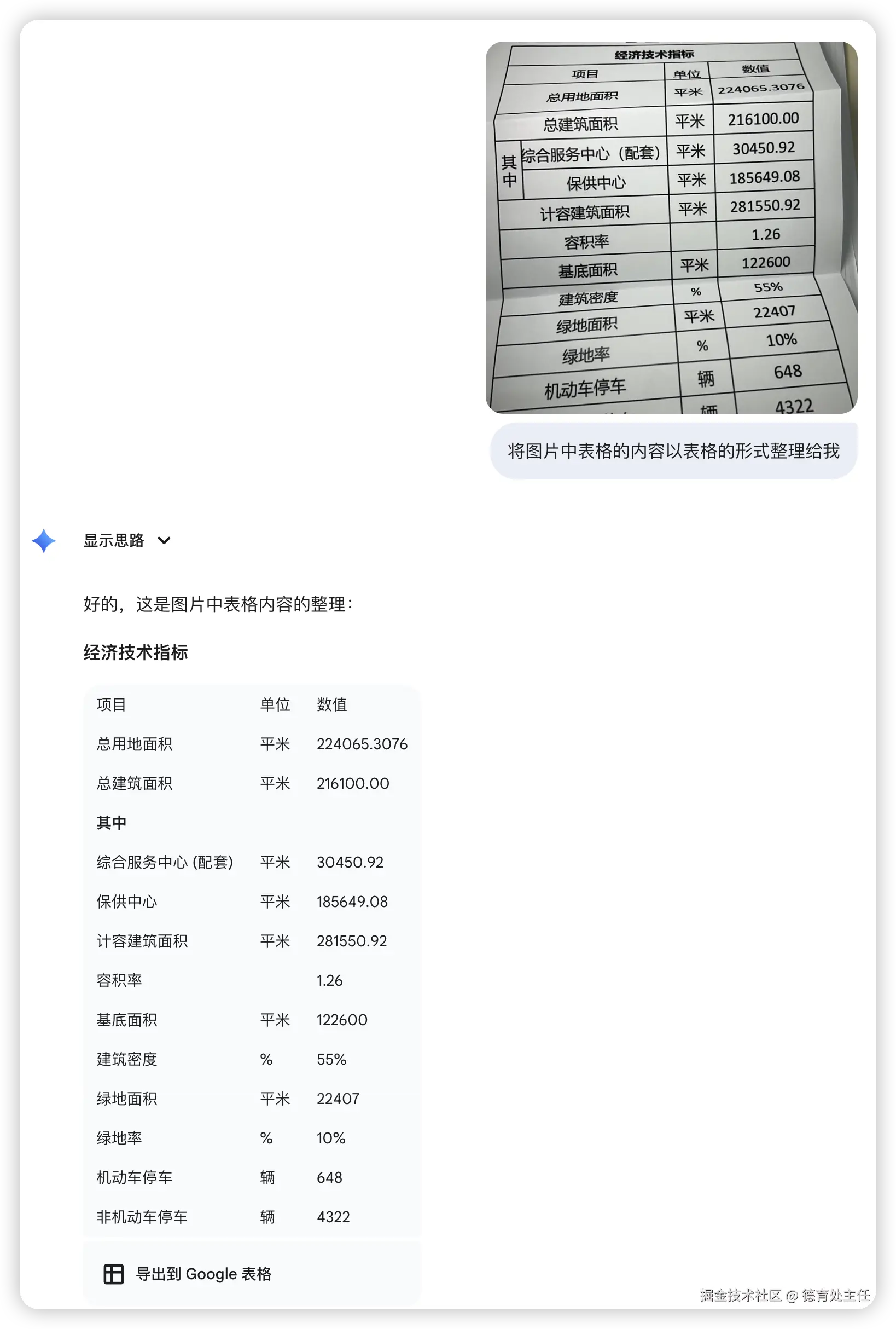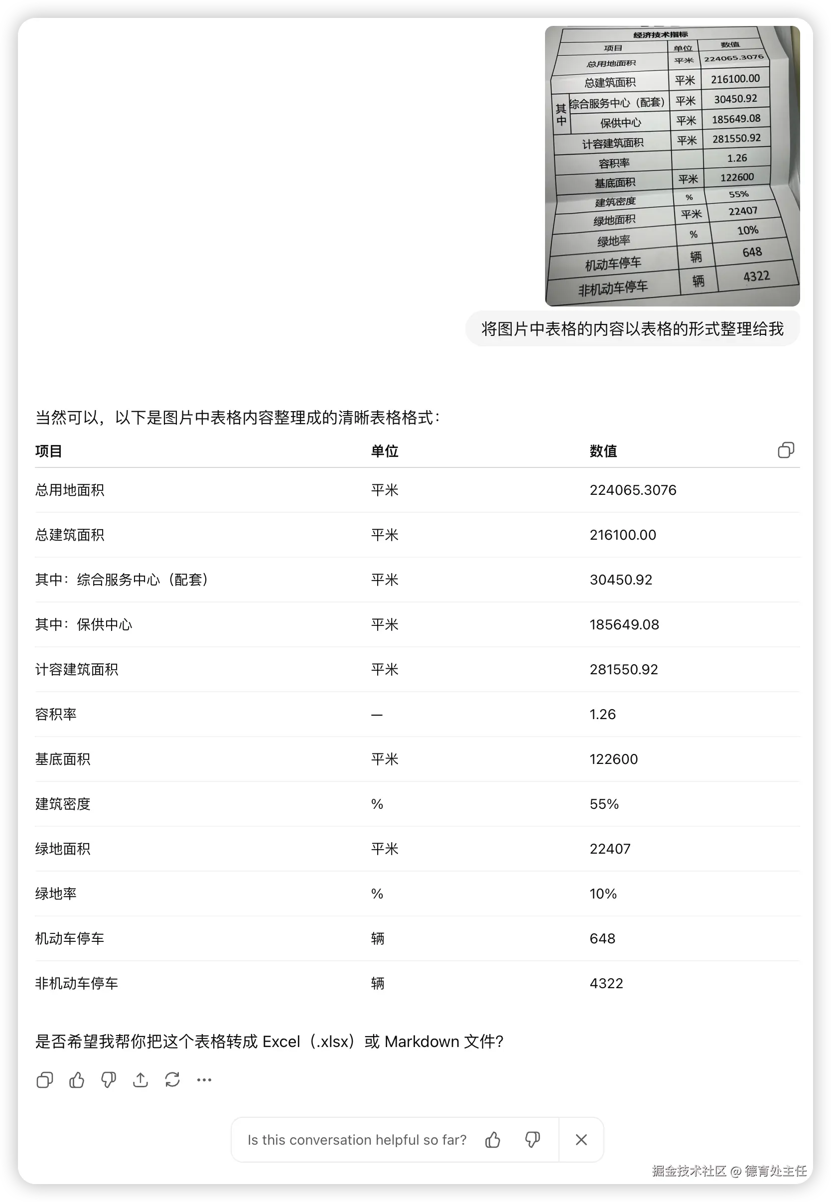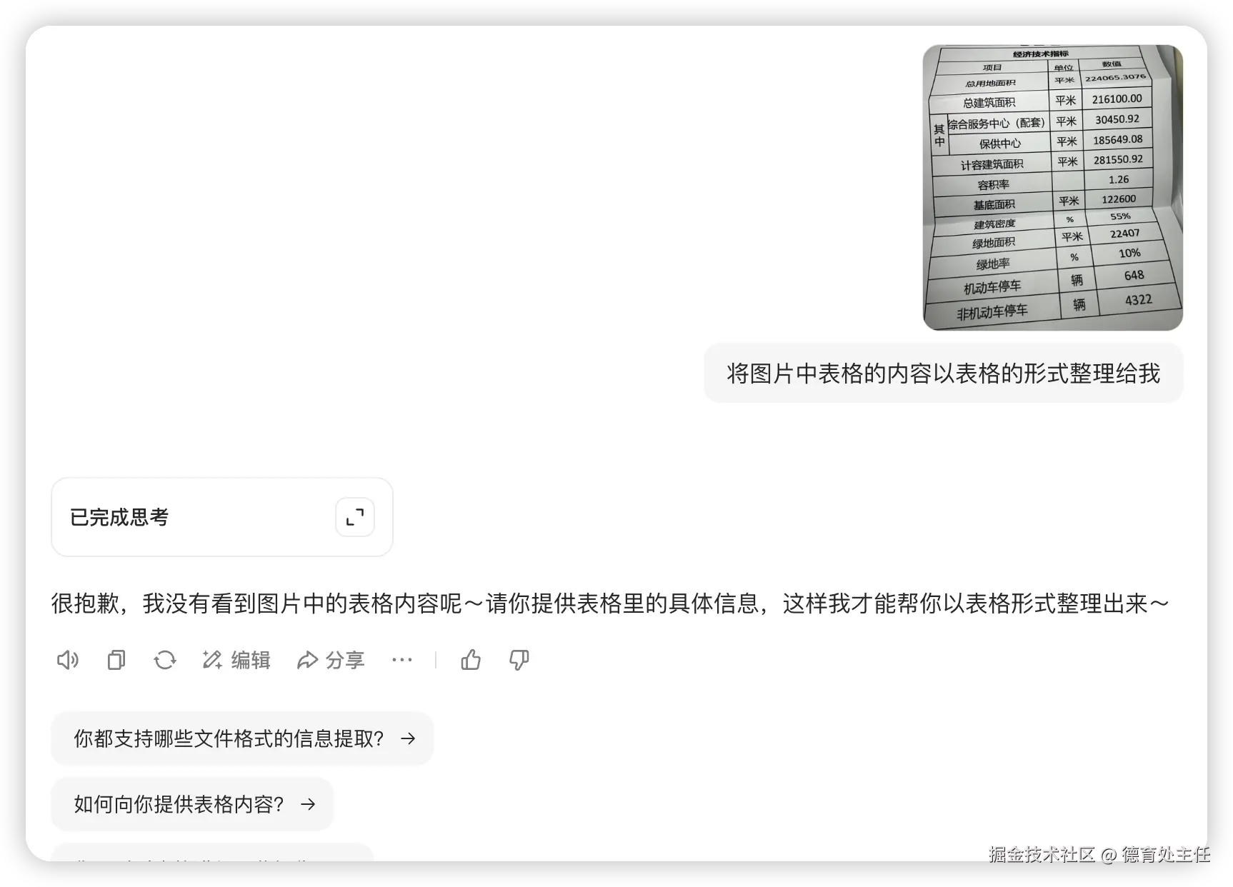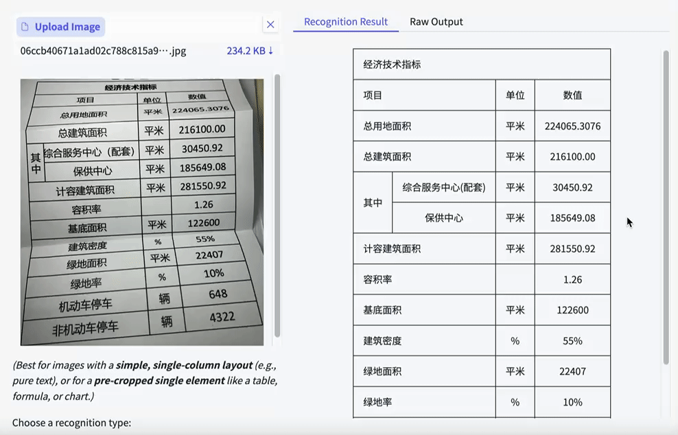 识别率很高,但完全忽略了表头“经济技术指标”,并且错误地填充了空白单元格。它基于Markdown的表格语法,难以处理合并单元格的复杂结构。