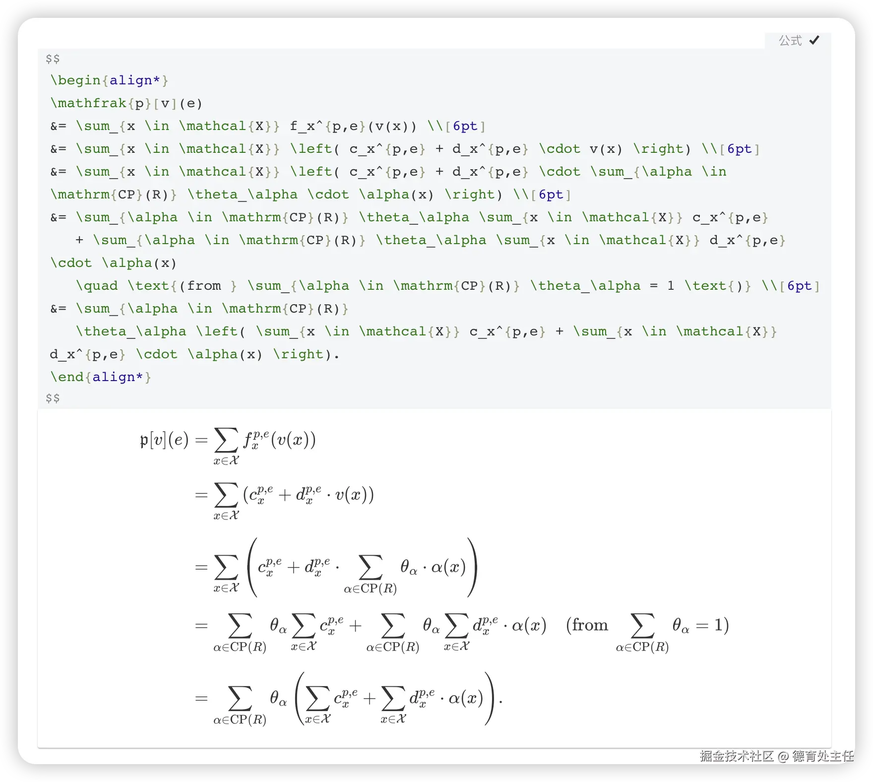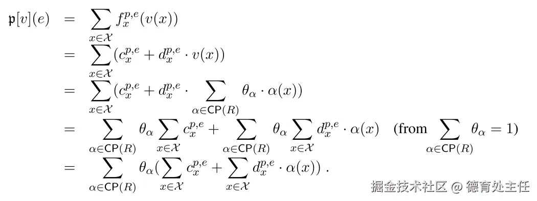 $$ \begin{array}{rcl}\mathfrak{p}v&=&\displaystyle\sum {x\ in \mathcal{X}}f{x}^{p,e}(v(x))&=&\displaystyle\sum {x\ in \mathcal{X}}(c{x}^{p,e}+d {x}^{p,e}\cdot v(x))&=&\displaystyle\ sum{x\in\mathcal{X}}(c {x}^{p,e}+d{x}^{p,e}\cdot\sum {\alpha\ in \mathsf{CP}(R)}\theta{\alpha}\cdot\alpha(x))&=&\displaystyle\sum {\alpha\ in \mathsf{CP}(R)}\theta{\alpha}\sum {x\ in \mathcal{X}}c{x}^{p,e}+\sum {\alpha\ in \mathsf{CP}(R)}\theta{\alpha}\sum {x\ in \mathcal{X}}d{x}^{p,e}\cdot\alpha(x)\quad(\mathrm{from}\sum {\alpha\ in \mathsf{CP}(R)}\theta{\alpha}=1)&=&\displaystyle\sum {\alpha\ in \mathsf{CP}(R)}\theta{\alpha}(\sum {x\ in \mathcal{X}}c{x}^{p,e}+\sum {x\ in \mathcal{X}}d{x}^{p,e}\cdot\alpha(x)).\end{array} $$