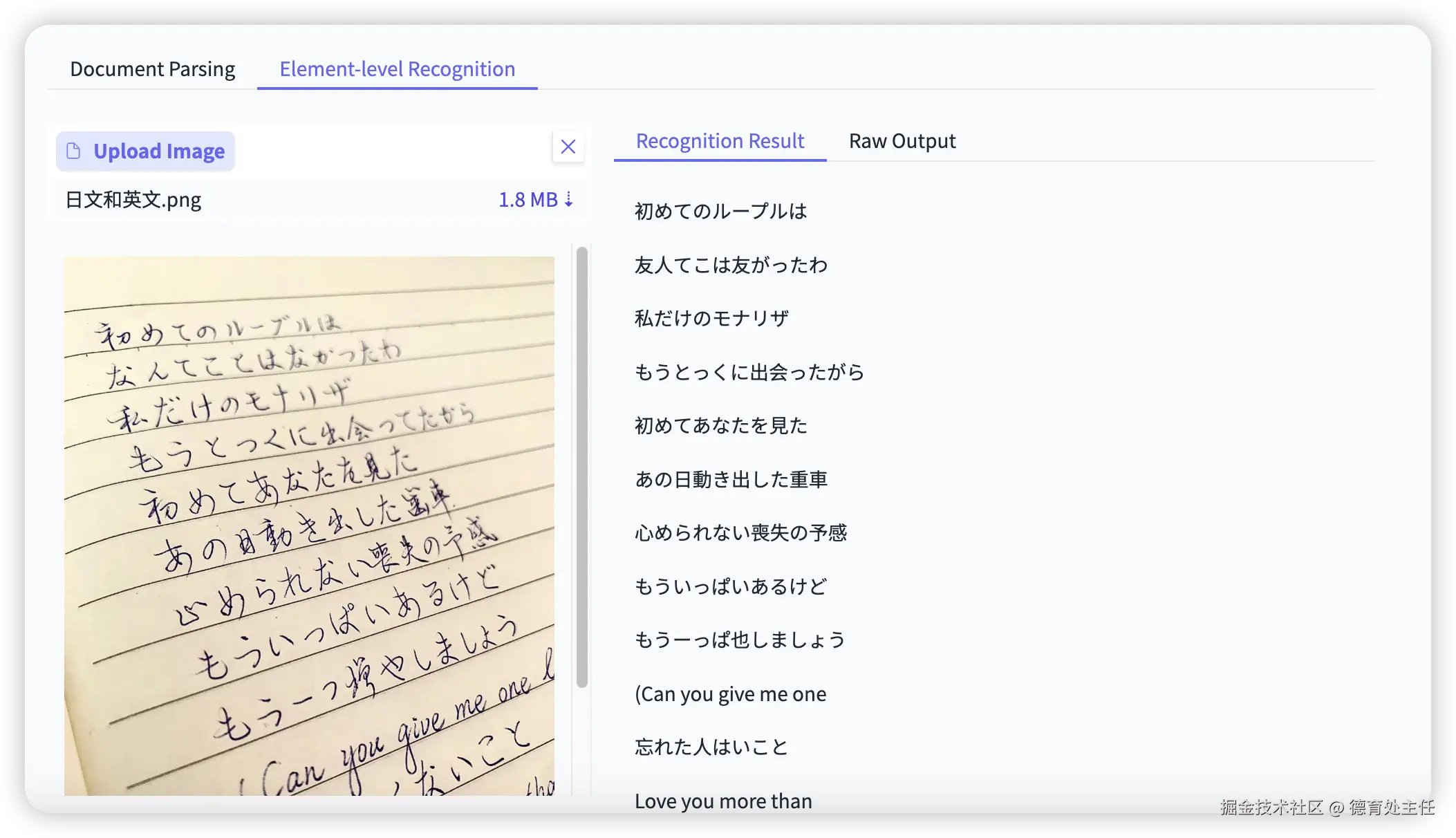 识别率尚可,但它将日语和英语部分分开了,并且分离得不彻底,英文部分还夹杂着日文。