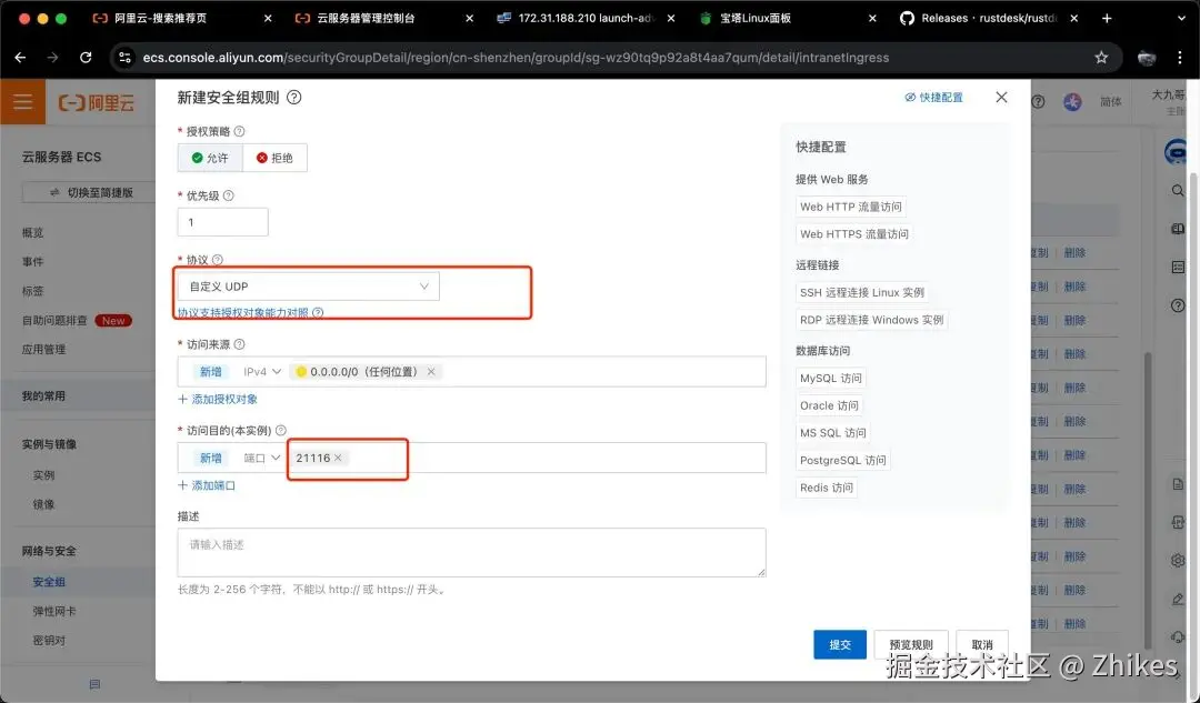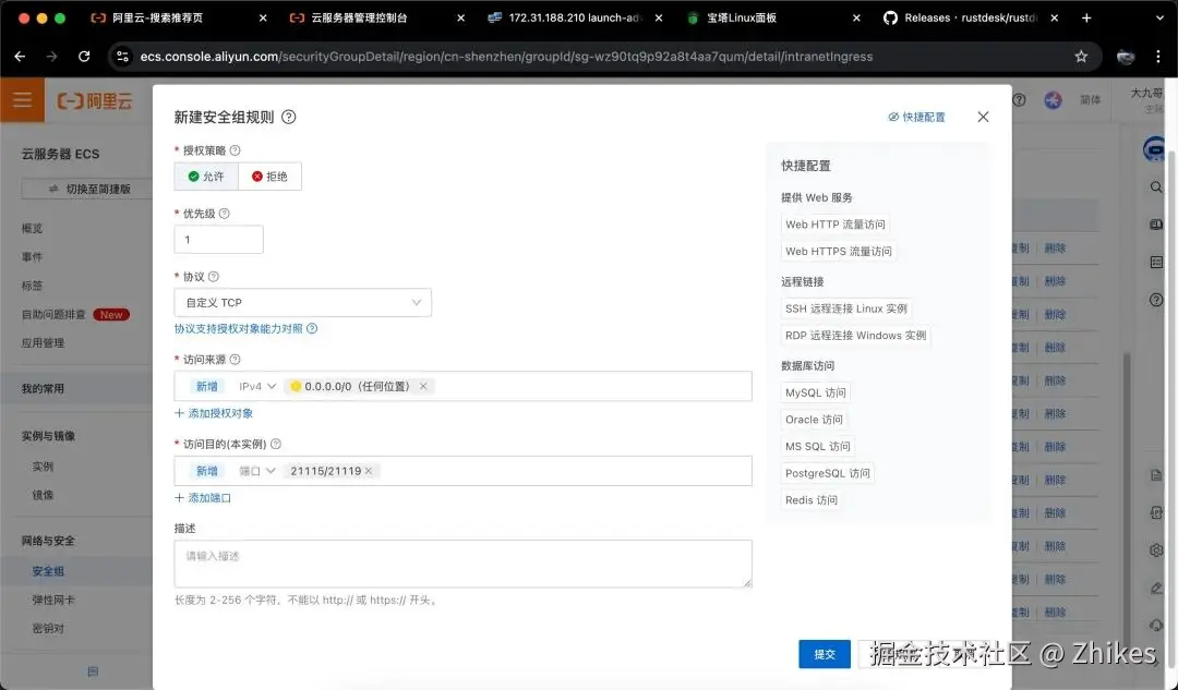 再去服务器放开端口,TCP开放21115~21119端口,UDP开放21116端口