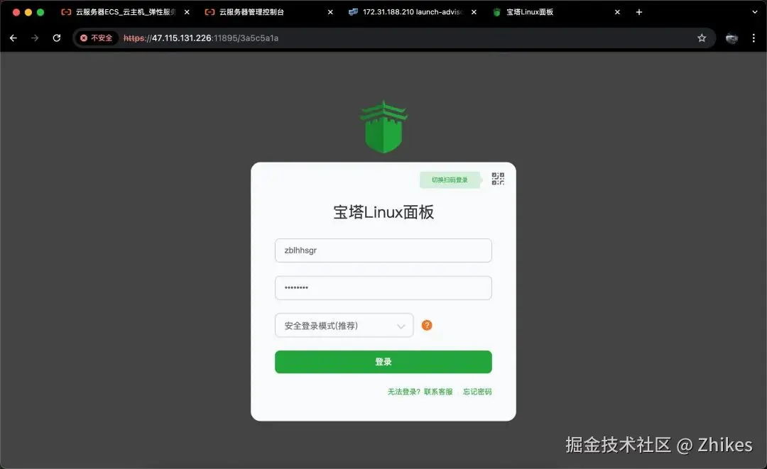 输入上面获取的面板登录 账号 username,密码 password,登录宝塔面板