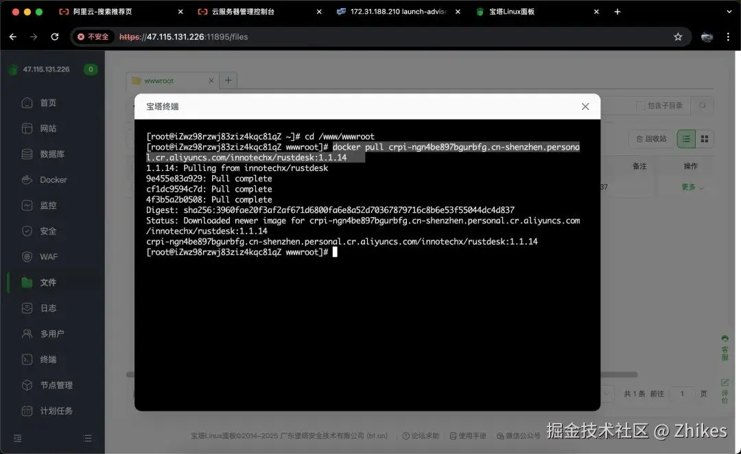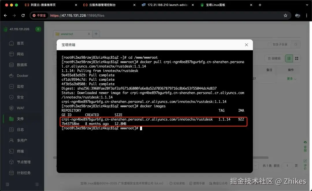 先使用docker命令拉取镜像,这里我把rustdesk的镜像放到了我的 阿里云容器镜像服务arc,国内服务器直接拉取 docker hub上的 rustdesk/rustdesk-server 镜像 容易超时报错。