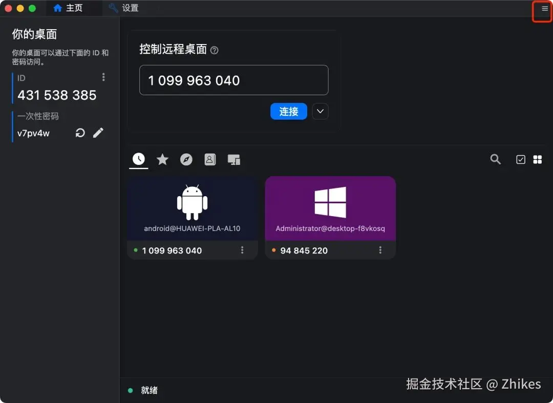 下载软件后在软件中配置好ID/中继服务器,这里以Mac电脑端控制Android端为例