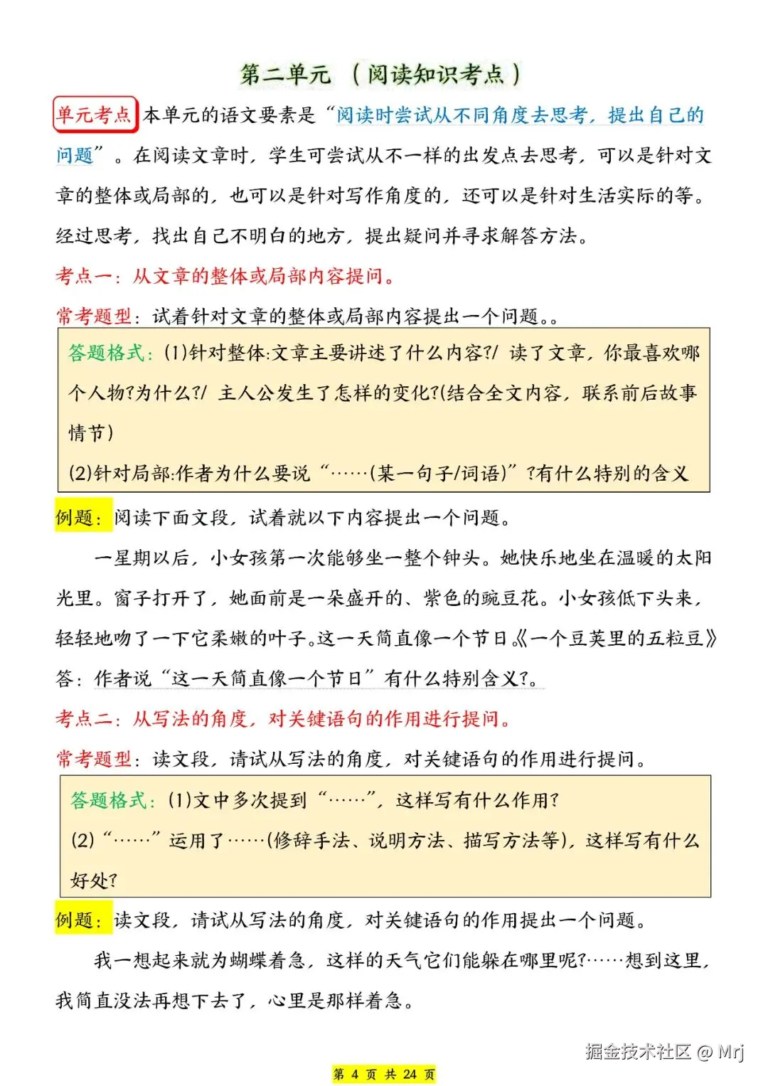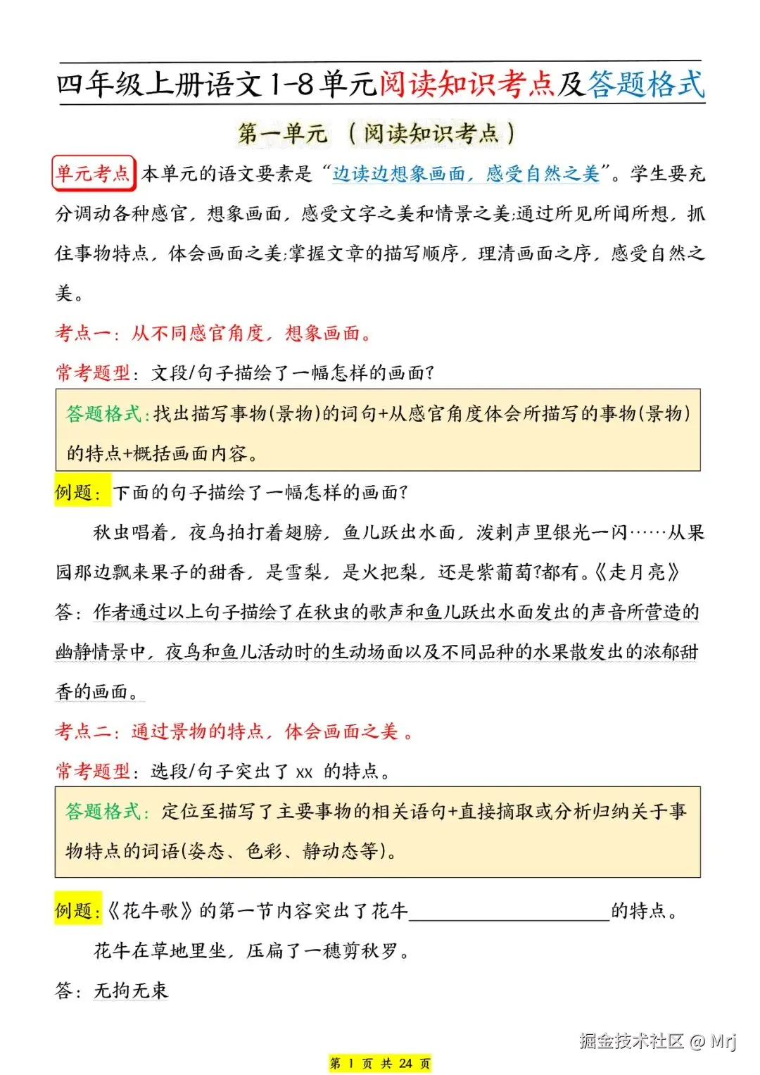 人教部编版四年级上册语文1-8单元《阅读知识考点及答题格式》,共24页,电子版可下载,这份四上阅读知识考点,包含了每个单元的单元考点、常考题型及答题格式,让孩子在面对阅读理解时有章可循,不再盲目答题,提升阅读理解能力。需要的家长抓紧打印出来,让孩子练一练吧。
