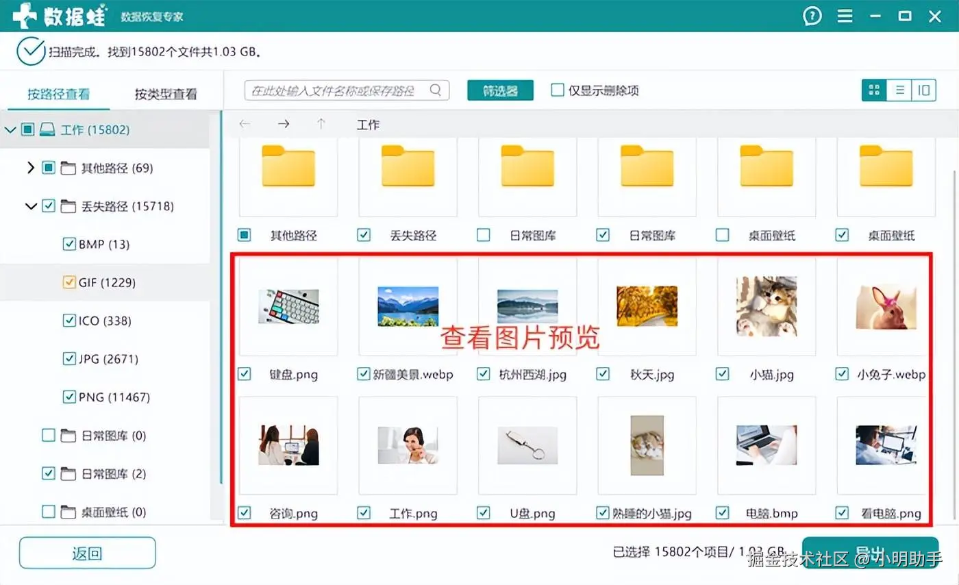 数据 蛙恢复专家对于需要图片恢复的朋友来说,最大的帮助是可以将扫描出来的图片内容预览出来,这样用户就无需将全部图片文件恢复出来后,再搜索目标照片,省时省力。