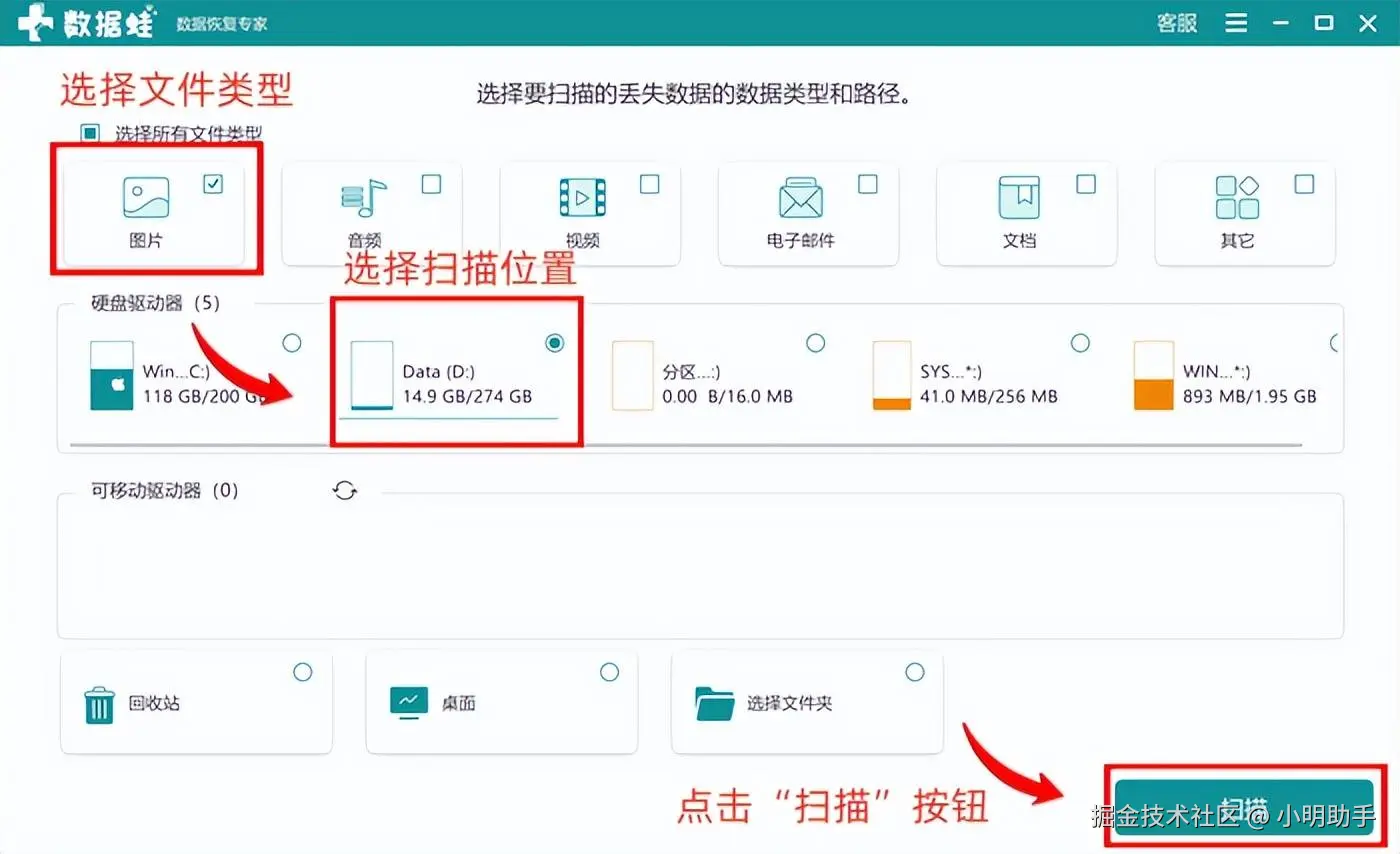 除此之外,这款名为数据 蛙恢复专家的照片恢复软件还是视频恢复软件,它支持的文件类型有上百种,当我们有其他的电脑数据恢复需求时,数据 蛙恢复专家也能派上用场。该软件的扫描范围也十分多样,不仅支持电脑内部硬盘,而且还支持U盘、SD卡、移动硬盘等外部存储设备进行扫描。