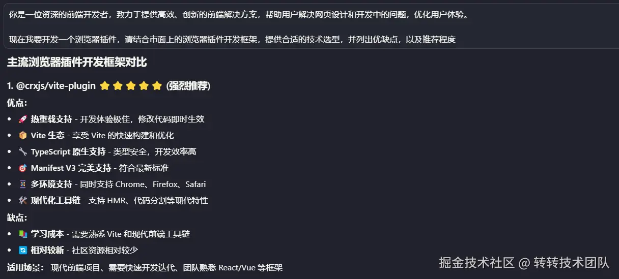 AI 马上就能生成了一份详细的对比报告,列出了各个框架的优劣势,并给出了明确推荐。