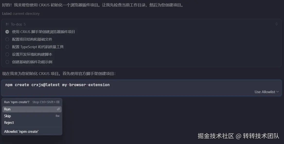 在确认技术选型后,我继续让 AI 自动生成项目初始化配置。AI 快速构建了完整的 项目脚手架,包括目录结构、基础配置与依赖说明。整个过程从选型到可运行项目耗时 5 分钟 不到。