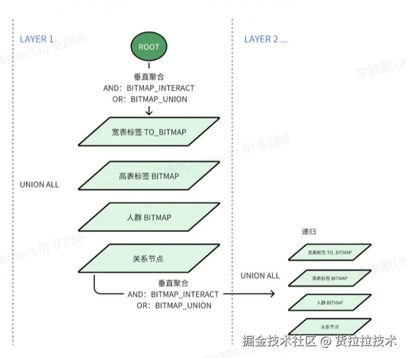 UNION ALL整合宽表/高表/人群表三种数据源的 Bitmap,并使用外层的BITMAP_INTERSECT/BITMAP_UNION实现跨模型交并集运算(AND/OR 逻辑)。 - 第三步,由于