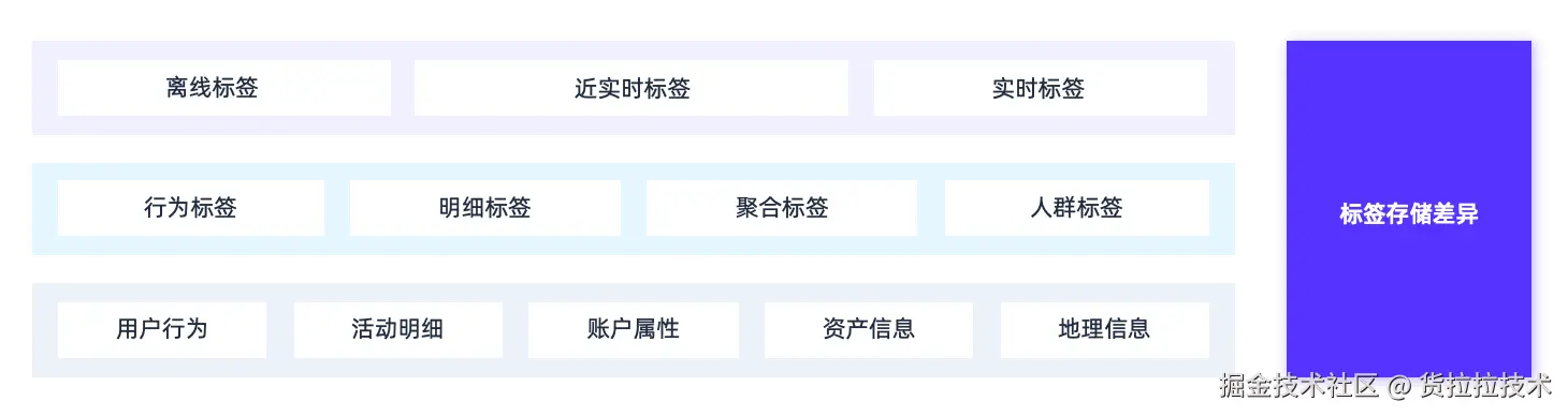 首先是用户画像标签存储的挑战。面对 3000+ 标签的体系,我们发现标签数据天然存在三个维度的分裂特征:业务属性(行为/属性/地理等)、聚合粒度(明细/聚合/人群)、更新时效(离线/近实时/实时)。不同业务属性的数据在更新频率、查询模式、存储密度上差异巨大。