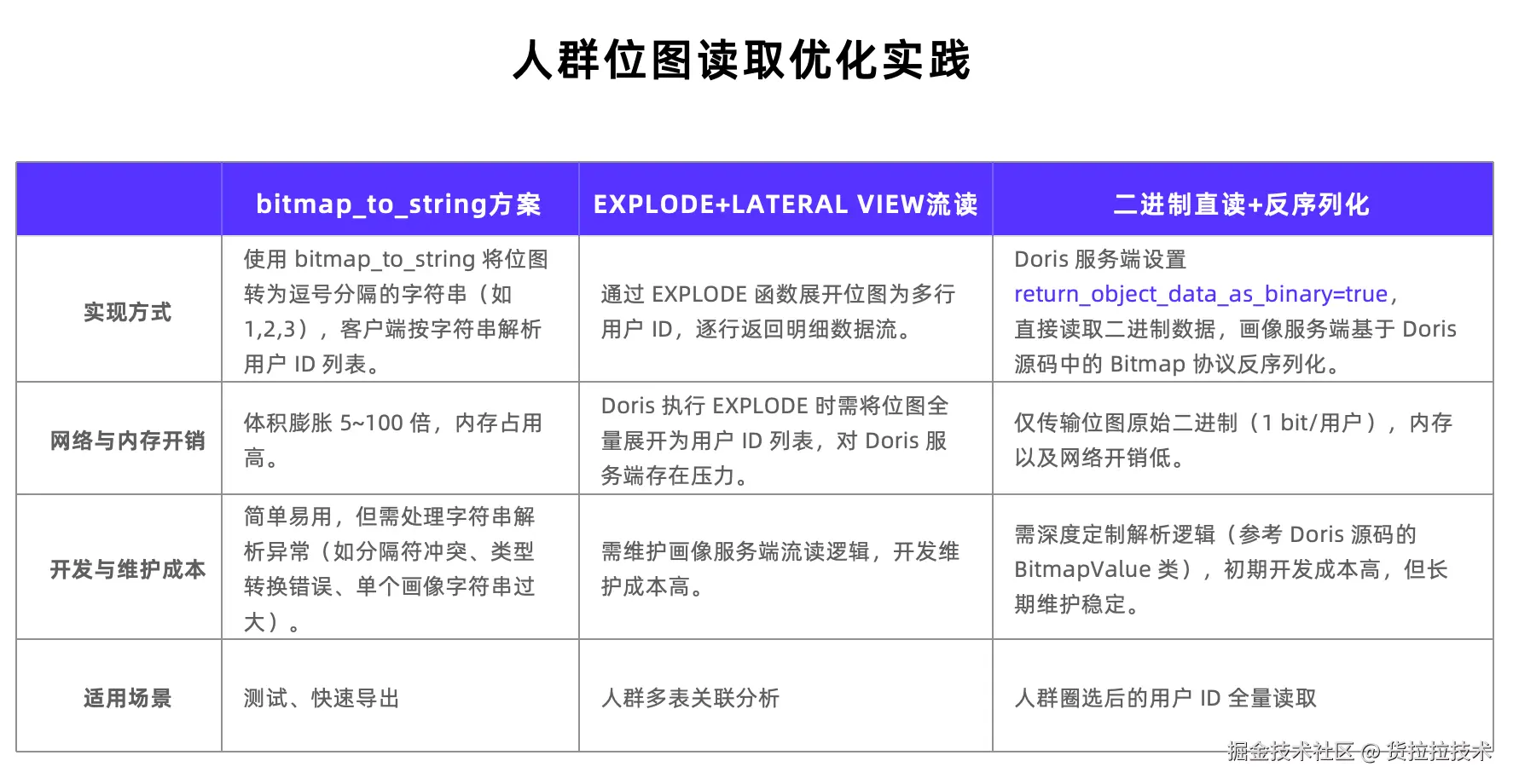 explore与lateral view先将整个位图展开,再构建服务端流处理逻辑。不过,Doris 需将位图展开成用户列表并缓存于服务器,这会给服务端带来压力,尤其在高峰期,人群计算任务繁重时更为明显。此外,画像工程侧需维护流处理逻辑,开发维护成本较高。该方案适合人群多表的关联分析。 - 第三种方案,也是较为推荐的方案,直接将位图的二进制数据读取至服务端内存,再进行反序列化。服务端设置