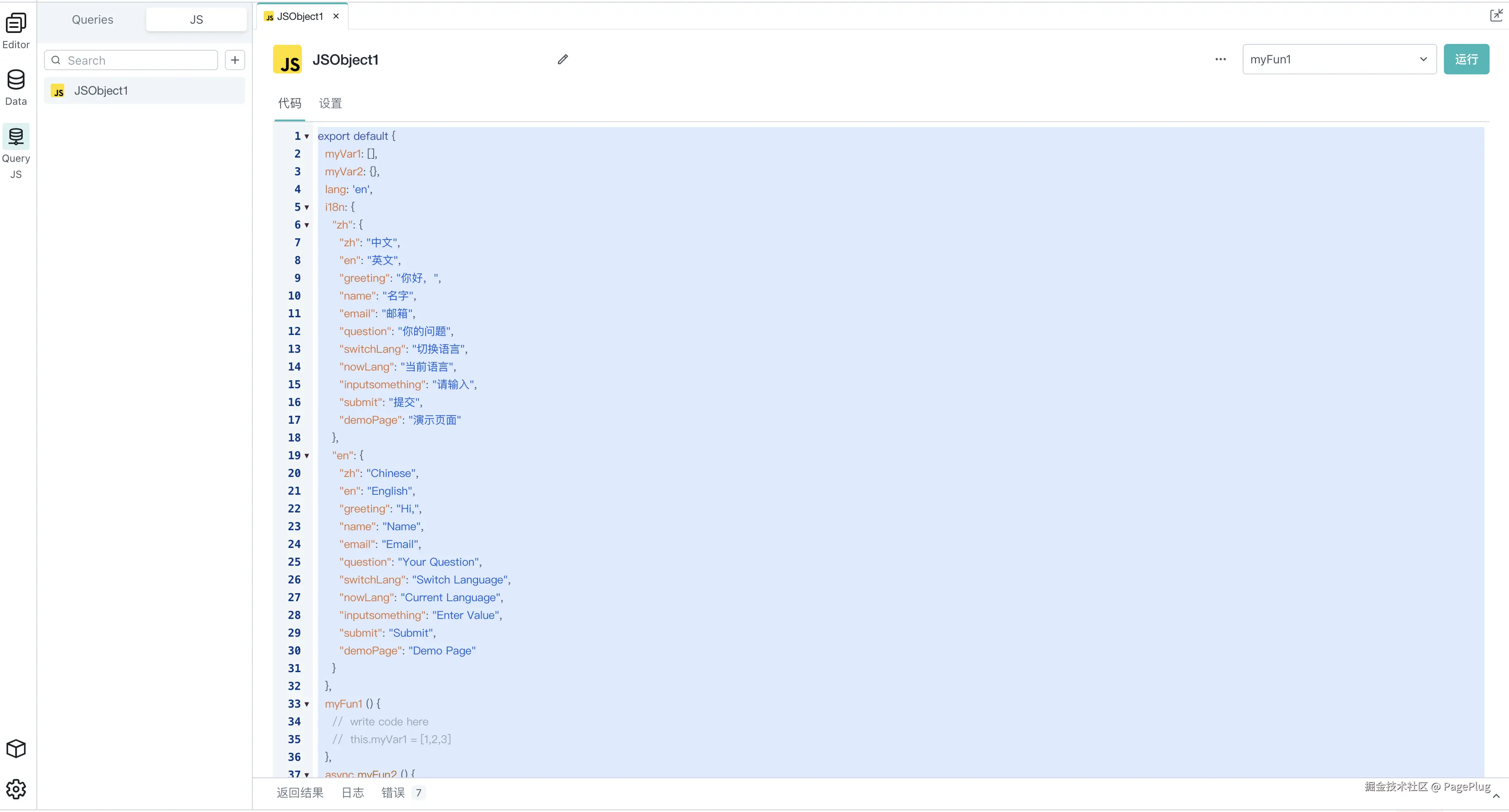2、创建应用后,我们新建一个JSobject,并贴入下面的代码,配置一份中英语言包: