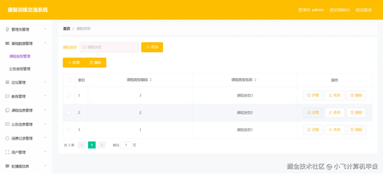 基于此,系统核心目标明确:用 Spring Boot+Vue+MySQL 搭建 “课程管理 + 师生交流 + 机构运营” 一体化康复训练交流系统,实现 “课程预约、教练查询、论坛交流、订单管理” 全流程数字化,既解决用户训练痛点,又提升机构管理效率。