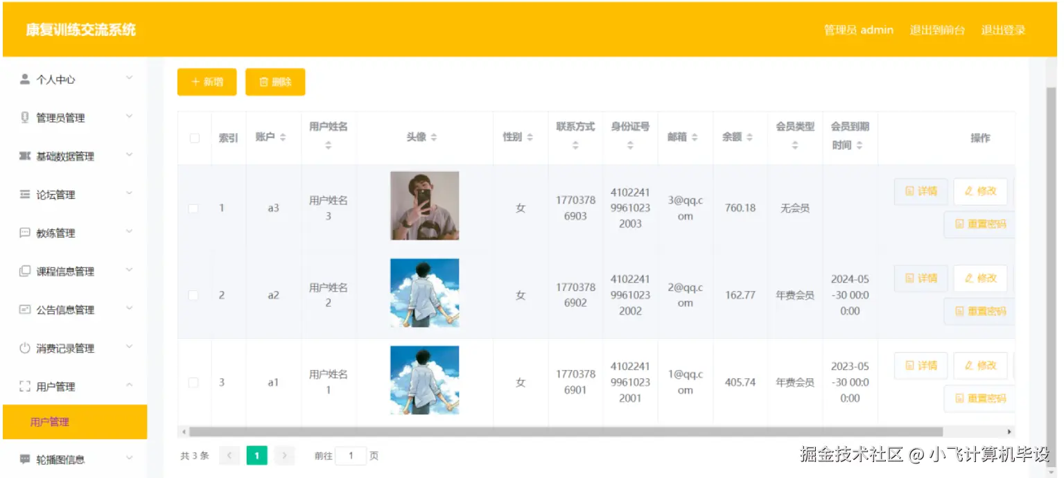 系统界面简洁,操作门槛低(康复用户 10 分钟可学会基础操作),适配 “管理员 - 教练 - 用户” 多角色协同,既满足康复机构运营需求,也为 Spring Boot+Vue 毕业设计提供了完整实战案例。
