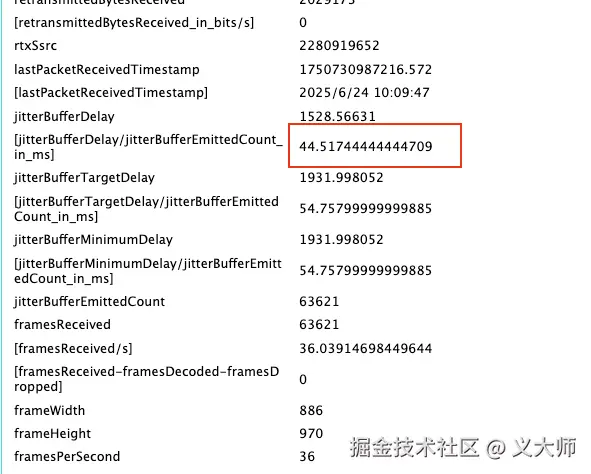 这里的H264的时延明显大于VP8,我们打印了一下时延,发现了一下是因为jitterBuffer的缓冲时延比较高,并且和帧率FPS呈现负相关性,就是帧率越低,我们的jitterBufferDelay越高,帧率越高,我们的jitterBufferDelay就越低,当画面是60fps采集的时候,我们的jitterBufferDelay的平均jitterBuffer时延是13~14ms。