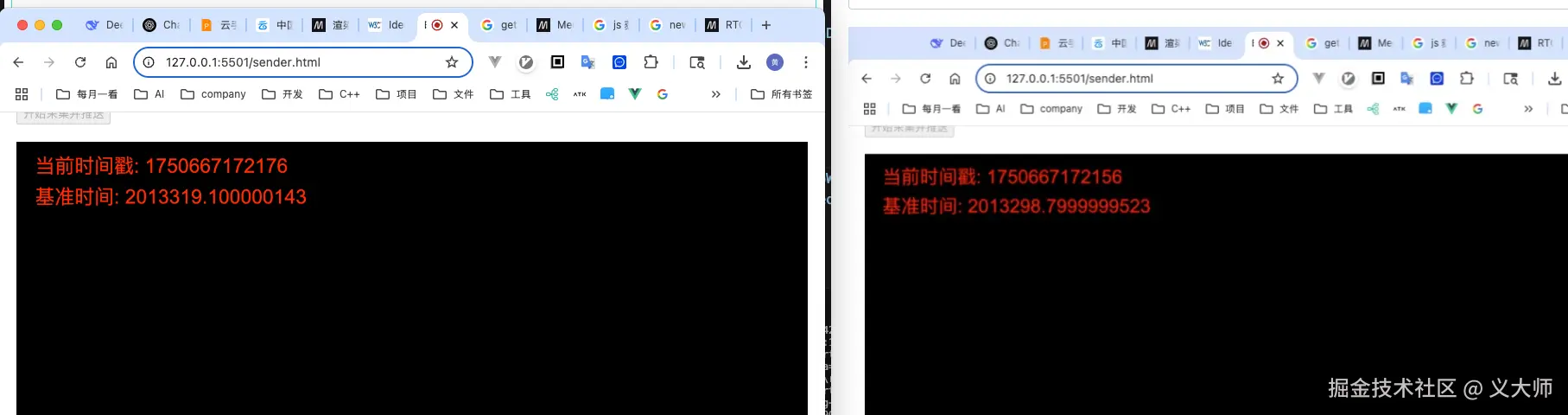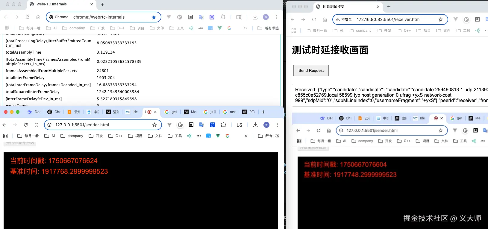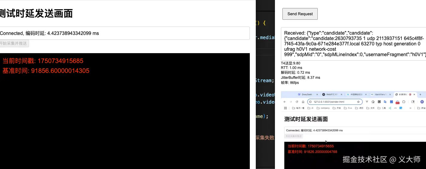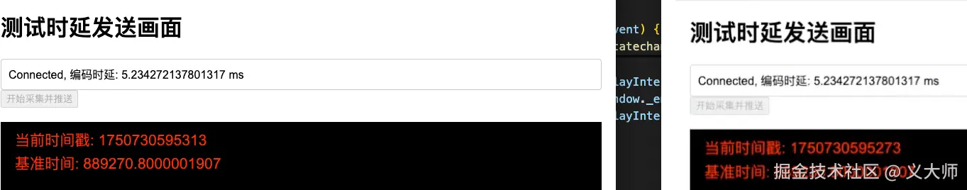 上图是我们的做的一个简单的示例截图,左边是我们的发送端,右边是我们的接收端。我们在连接建立之后,通过截图方法就可以得到不同端在同一个时间点的照片,我们通过canvas在画面上面渲染当前的时间。我们可以通过对比他们的时间差可以作为我们的两端的时延。