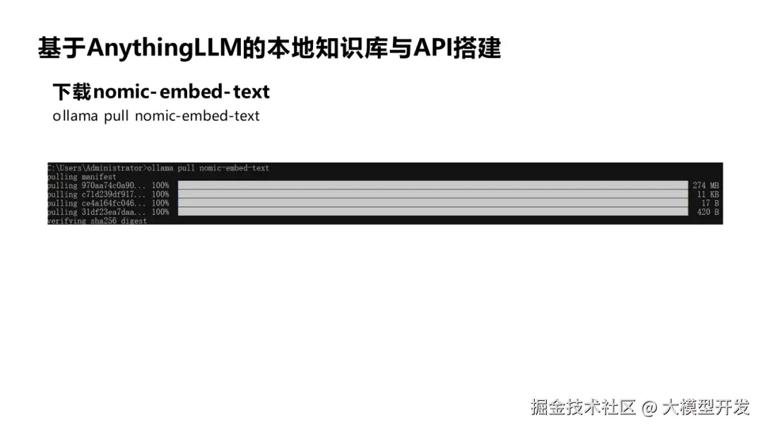 先通过 Ollama 下载向量模型:命令提示符输入ollama pull nomic-embed-text(用于文档解析)。