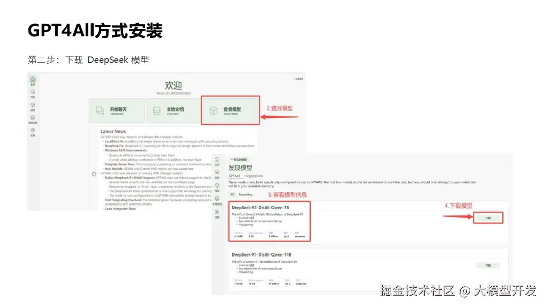 在 “发现模型” 中搜索 “DeepSeek-R1”,选择适合的版本(如 7B 量化版)下载。