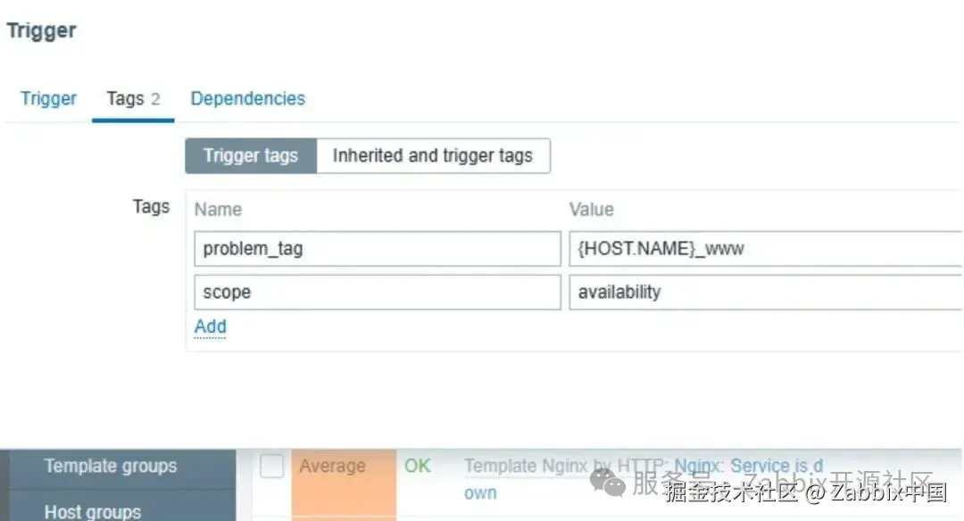 (如上图所示,我给Nginx: Service is down的Trigger新建了一个名字是problem_tag,值是{HOST.NAME}_www的新Tag。)
