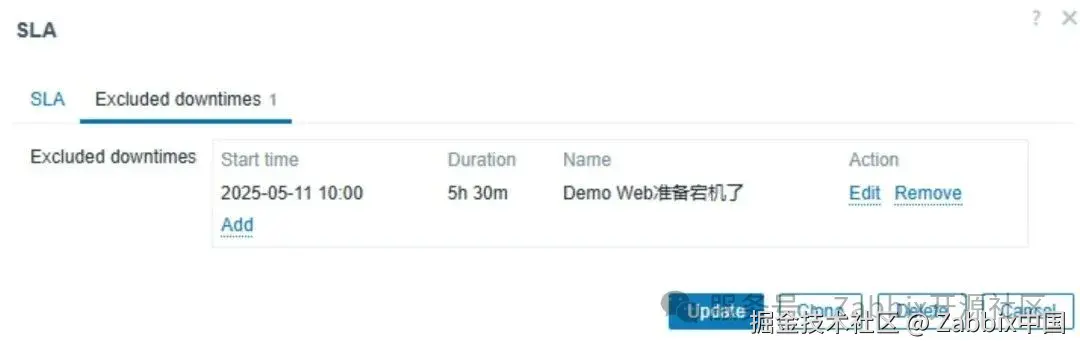 如果碰上系统、应用、电力等因素而不得不导致SLA受影响,但我们允许Zabbix里的SLA保持不变,可以按下面两个方法之一来设置: