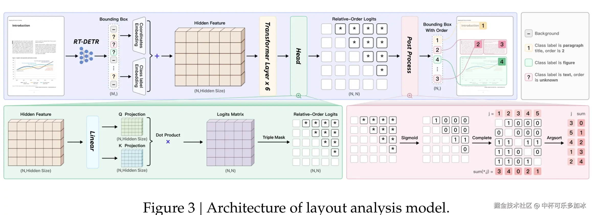 - 基于RT-DETR的目标检测模型:该模型负责精确地检测并分类文档中的各种元素,如文本块、表格、公式、图表、图片、页眉页脚等,并输出它们的边界框位置。
