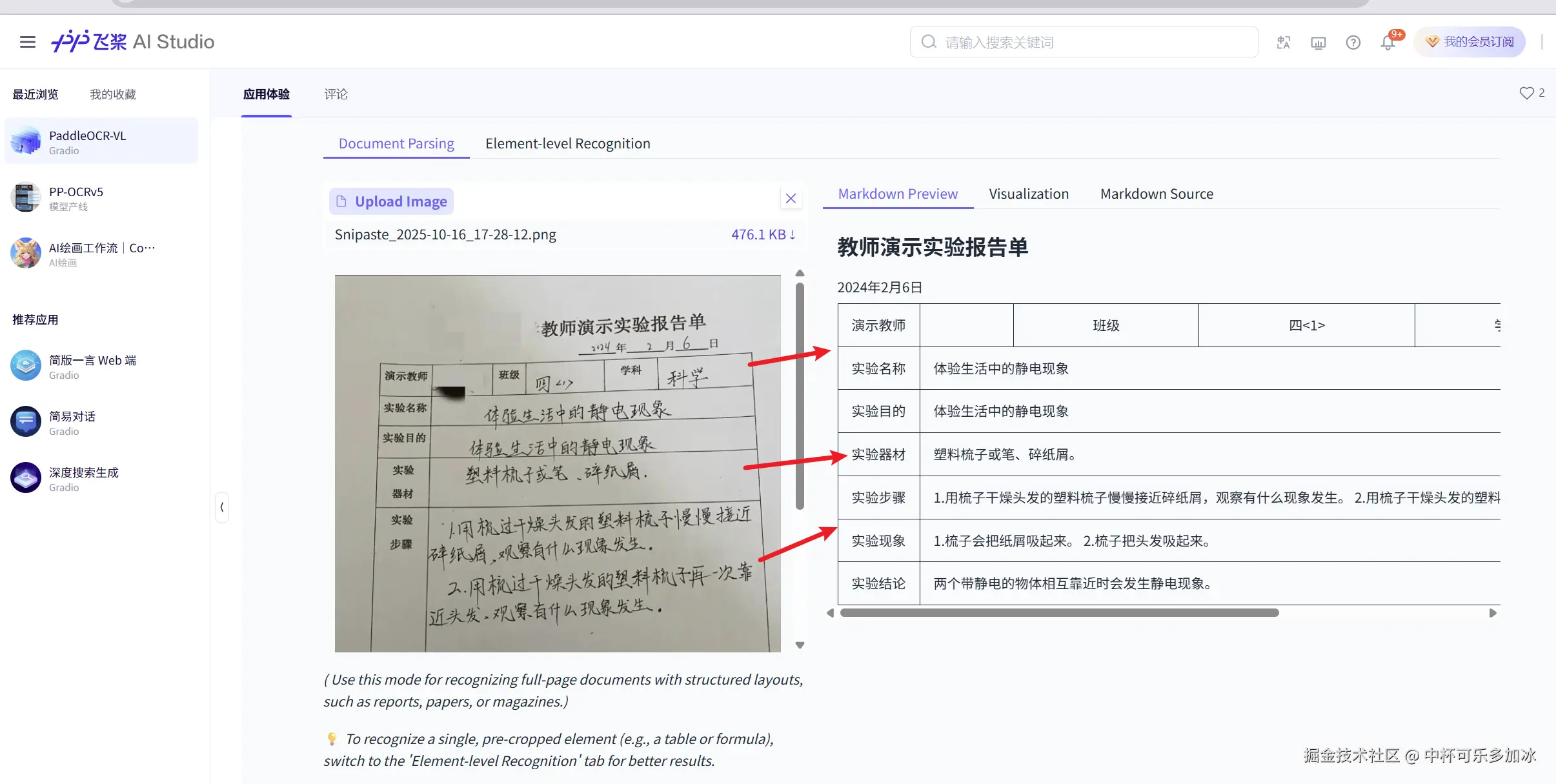 PaddleOCR-VL展现出了强大的手写体适应能力,准确识别了实验名称、目的、器材清单、操作步骤等关键信息。模型不仅将潦草的手写内容转换为可编辑的文本格式,还保持了原文的逻辑结构和语义完整性。这种能力使得手写笔记的数字化整理变得简单高效,为教育、医疗等领域的文档数字化提供了实用解决方案。
