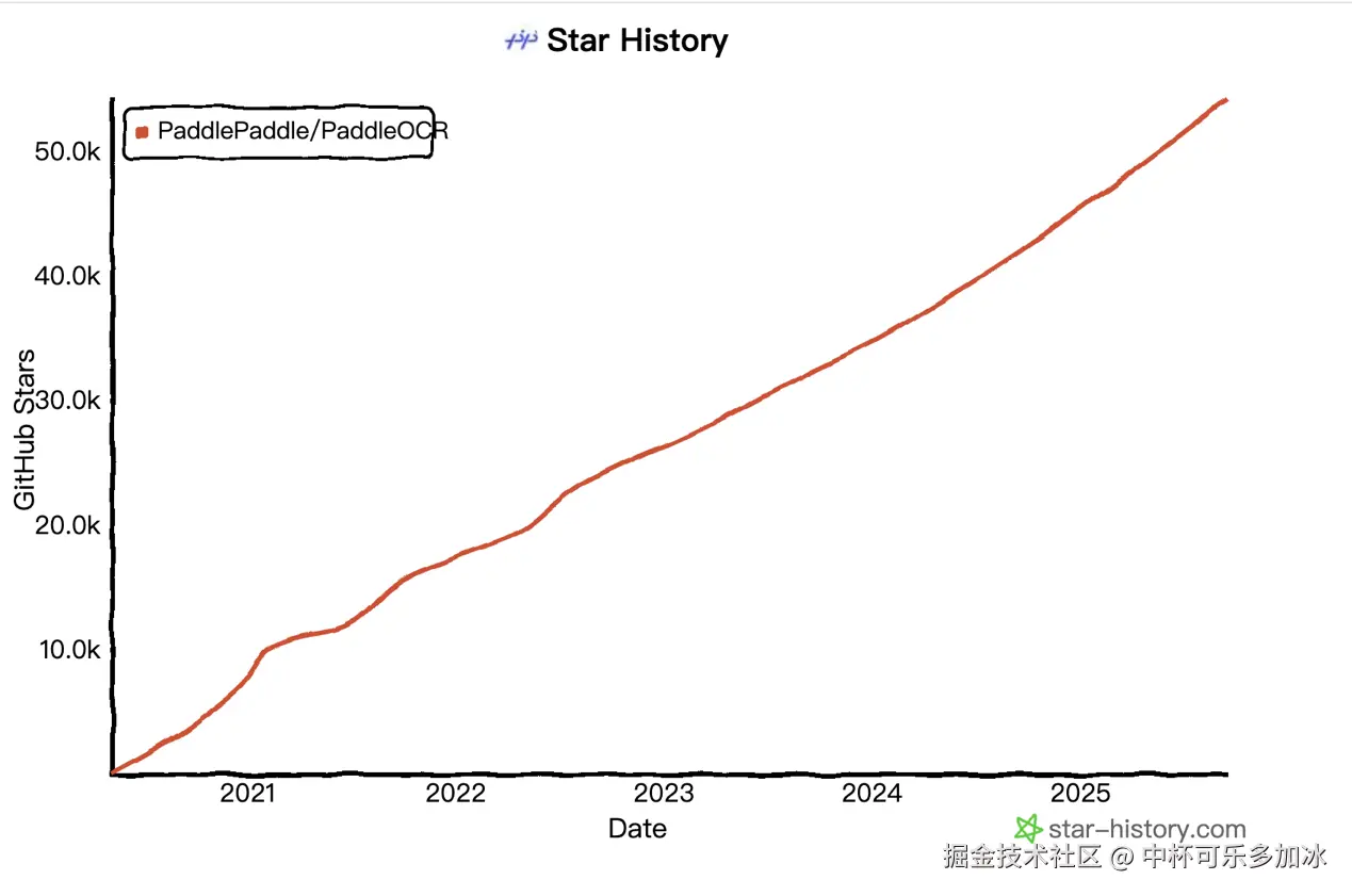 PaddleOCR项目自2020年开源以来,已成为GitHub社区中唯一一个Star数超过50k的中国OCR项目,累计下载量突破900万,被超过5.9k开源项目直接或间接使用。其技术实力和社区影响力可见一斑。