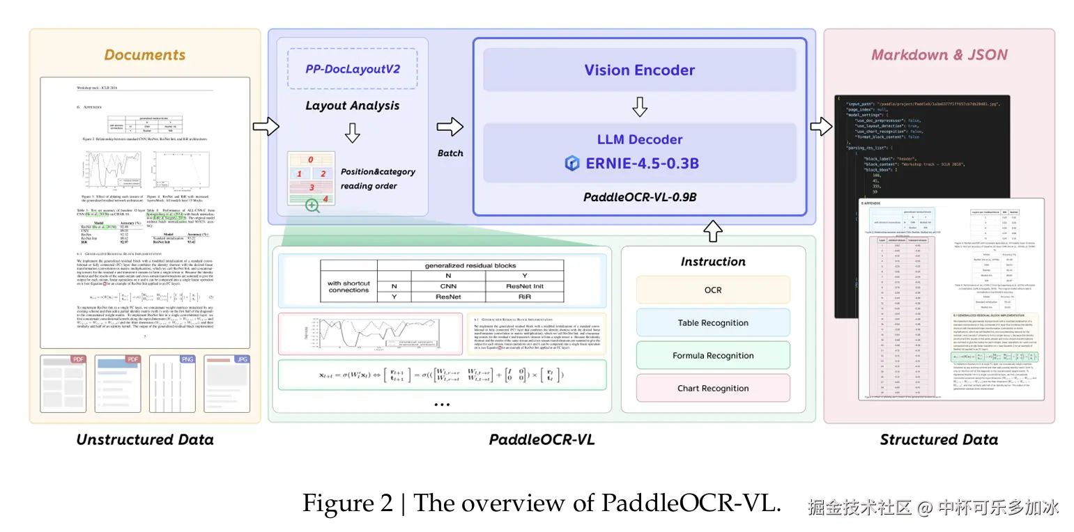 PaddleOCR-VL的核心创新在于其独特的混合式架构,它将轻量而强大的视觉语言识别模型PaddleOCR-VL-0.9B与高精度版面分析模型PP-DocLayoutV2深度融合。