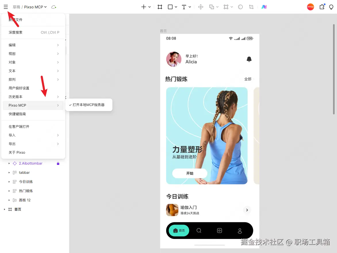 打开本地MCP服务器:在Pixso里打开你的设计文件,让文件处于激活状态。点击左上角的Pixso菜单,选择“Pixso MCP”>“打开本地MCP服务器”。