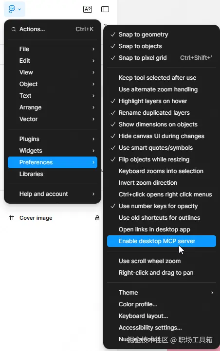 启用本地MCP服务器:打开Figma桌面应用,打开任意一个设计文件。然后,点击屏幕左上角的Figma菜单图标,依次进入“Preferences”(偏好设置)→“Enable local MCP server”(启用本地MCP服务器)。