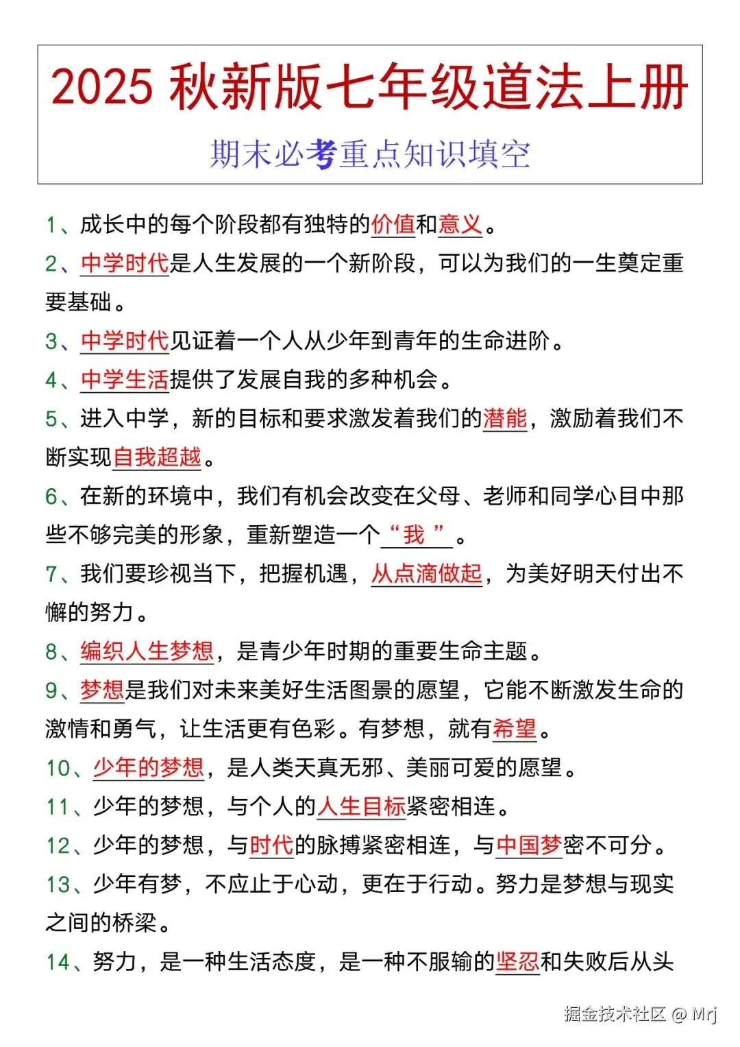 ****七年级道法上册期末备考抓重点!这份必考知识填空题太实用啦!聚焦教材核心考点,精准覆盖期末高频知识点,以填空形式帮学生巩固记忆、查漏补缺。助力初一学子梳理知识体系,夯实基础,高效突破复习难点,轻松应对道法期末考,是期末复习的优质资料