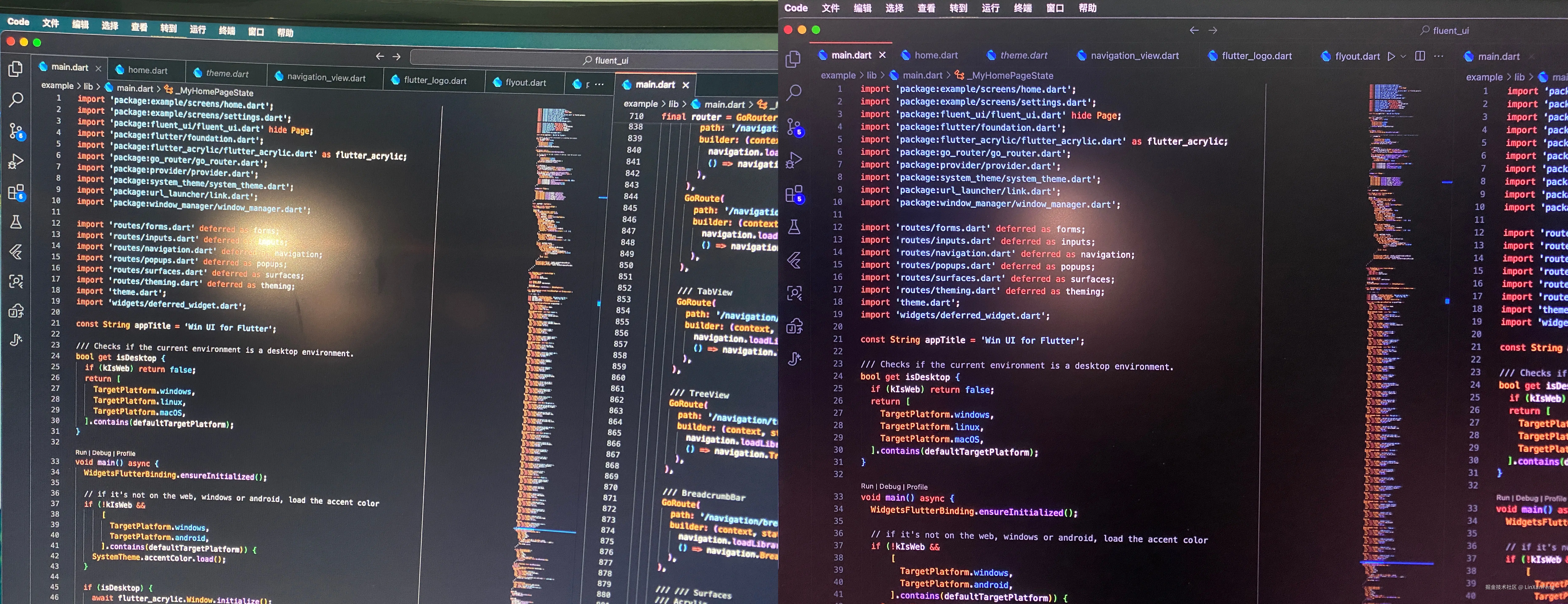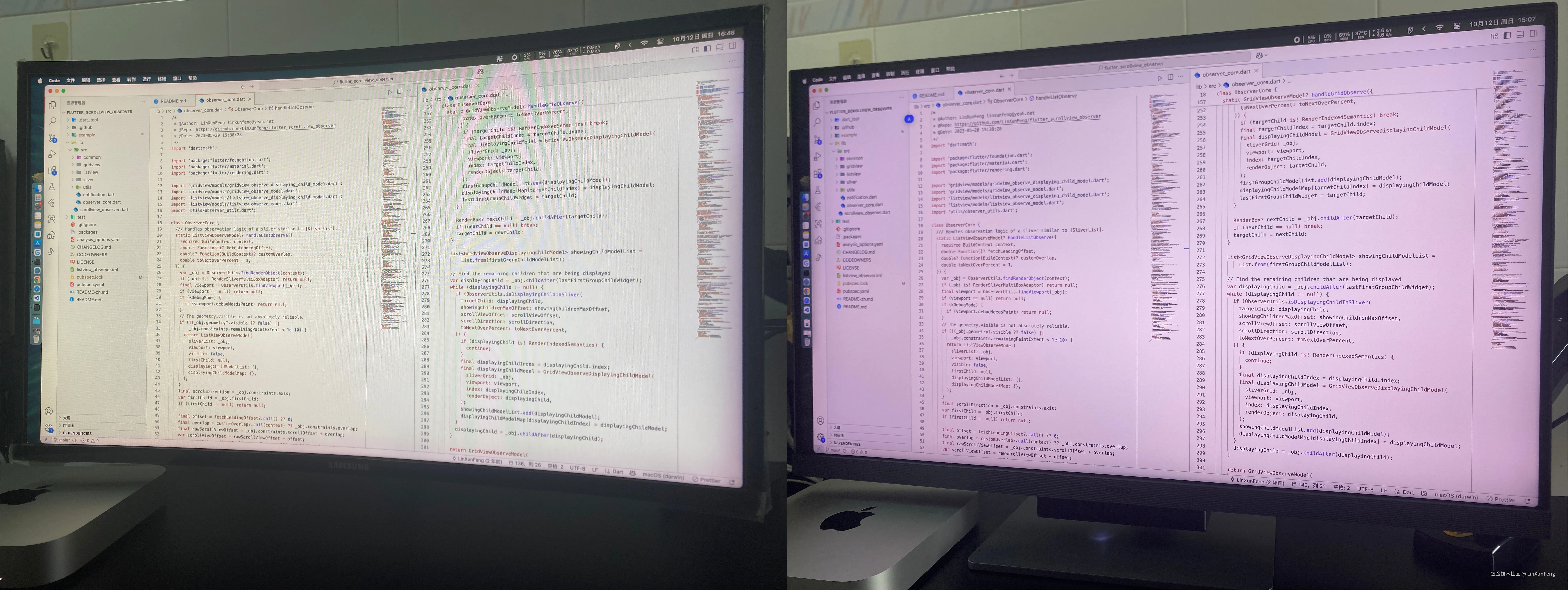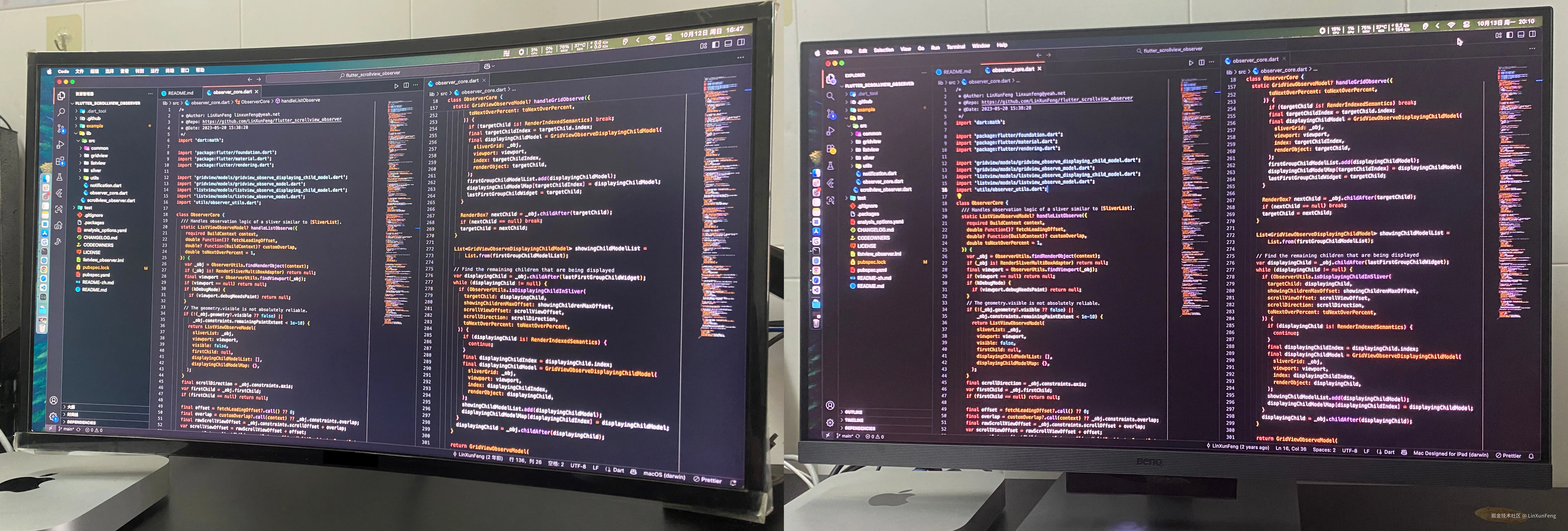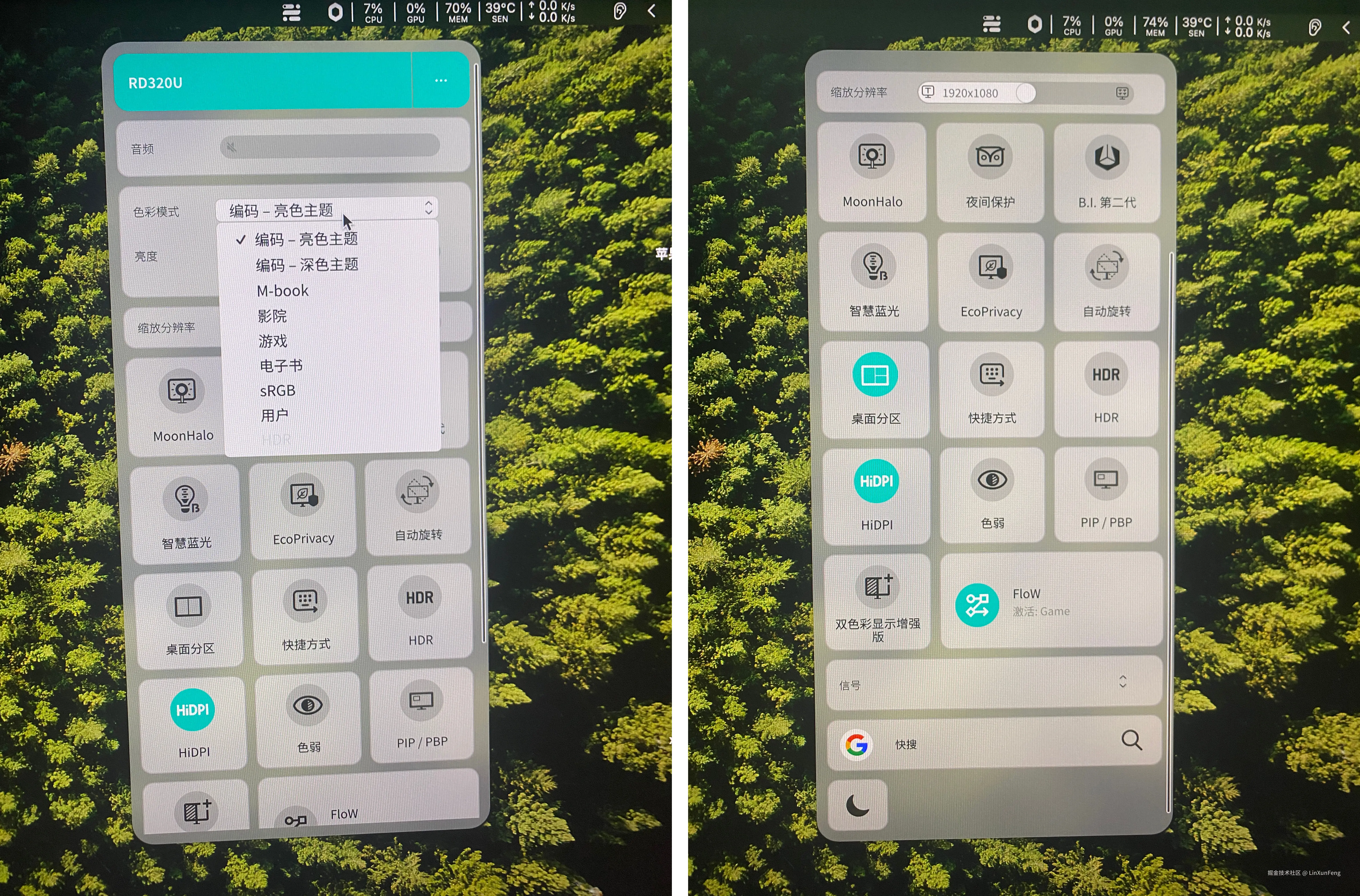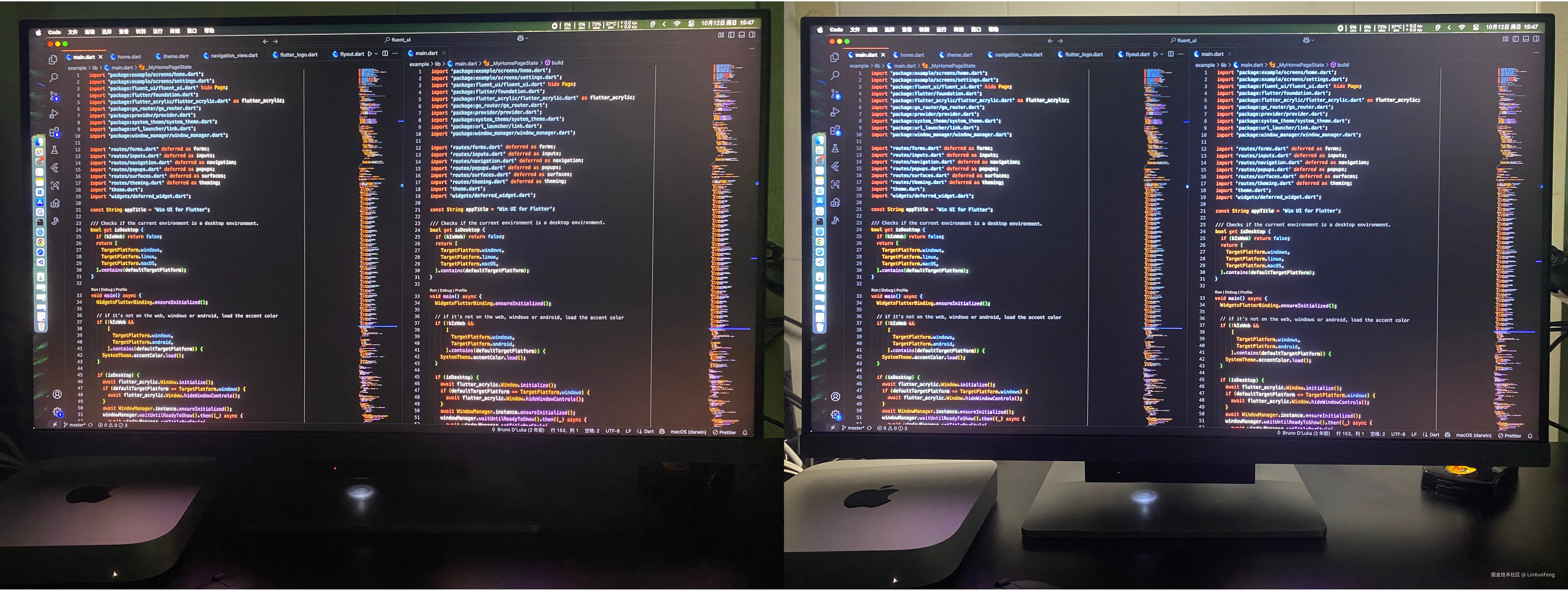左: 普通显示器 右:明基 RD320U 显示器(编码-深色主题)